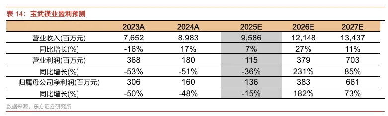 我们预计宝武镁业未来盈利将受益于高端镁合金产品加速渗透。我们认为,公司收入有望保持稳健增长;且随着产品结构持续优化、规模效应逐步显现,公司盈利能力有望在2025年触底后逐渐修复。预计2026/2027年归母净利润约3.8亿元和6.6亿元。整体来看,公司处于新旧动能转换的关键阶段,上游原镁一体化与高端镁合金放量有望驱动公司进入新一轮成长周期。