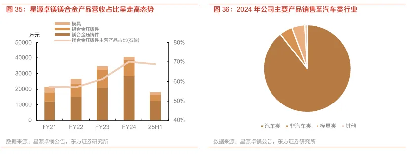 星源卓镁是国内领先的镁、铝合金压铸件供应商,主营收入以镁合金压铸件为主。公司镁合金压铸件产品2024年营收占比达70%,25H1维持在约69%,近年呈持续走高态势。下游主要面向汽车产业,2024年汽车类产品占比近90%,非汽车及模具业务占比有限。公司凭借在镁合金压铸技术及汽车核心零部件的深度布局,实现了收入快速增长与产品结构优化,是国内高端镁合金压铸件的重要供应商。