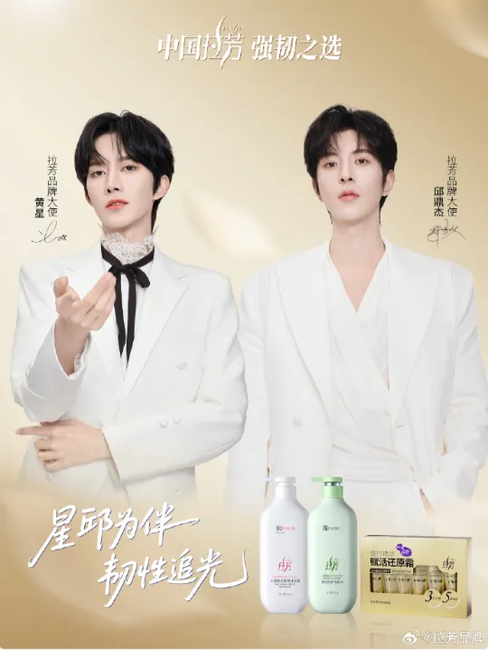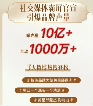 【拉芳】 1.15官宣品牌大使黄星&邱鼎杰,238.8元套组包含沐浴露+喷雾+发膜等,GWP为小卡、冰箱贴、吧唧、挂件,20分钟售罄,全平台销额1000w+