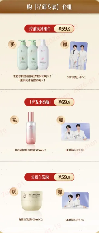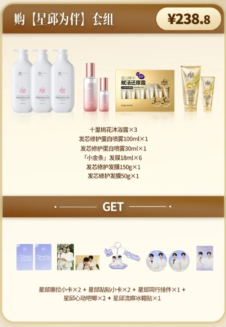 1.15官宣品牌大使黄星&邱鼎杰(Desire4男团成员,黄星99年、邱鼎杰98年内地男演员),238.8元套组包含沐浴露+喷雾+发膜等,GWP为小卡、冰箱贴、吧唧、挂件,20分钟售罄,全平台销额1000w+。