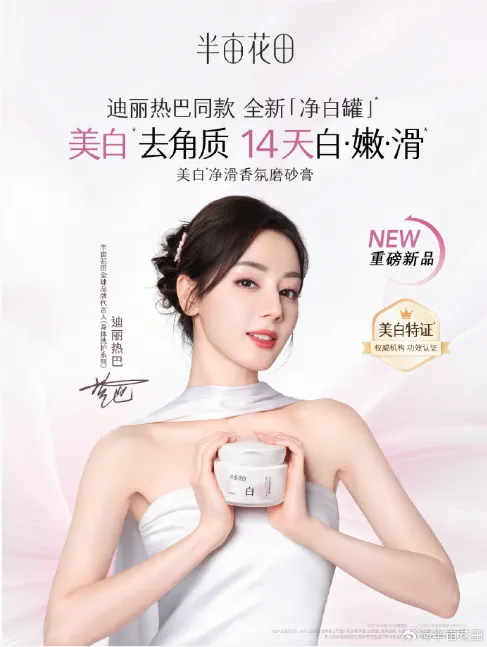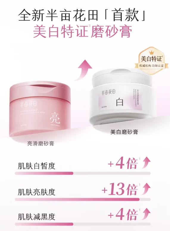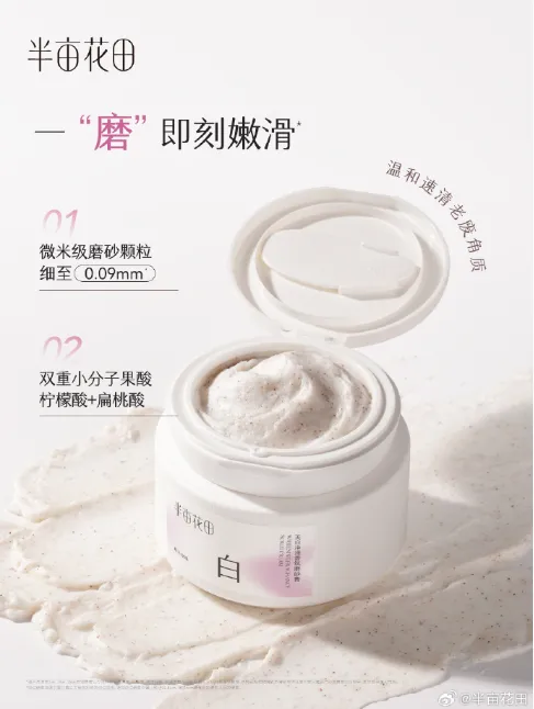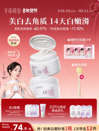 【半亩花田】 1.14推出全新净白磨砂膏(美白特证),沐浴磨砂美白三合一,200g/74.9元,送沐浴刷及代言人小卡