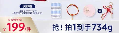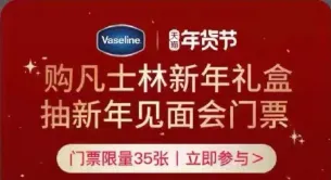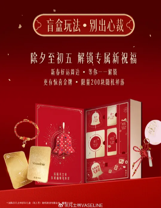 1.16上线新年限定礼盒(晶冻+手霜+唇膏+面霜),199元/套,购买有机会抽代言人章昊见面会门票。老产品焕新包装,"凡士林≈凡事灵"谐音梗。