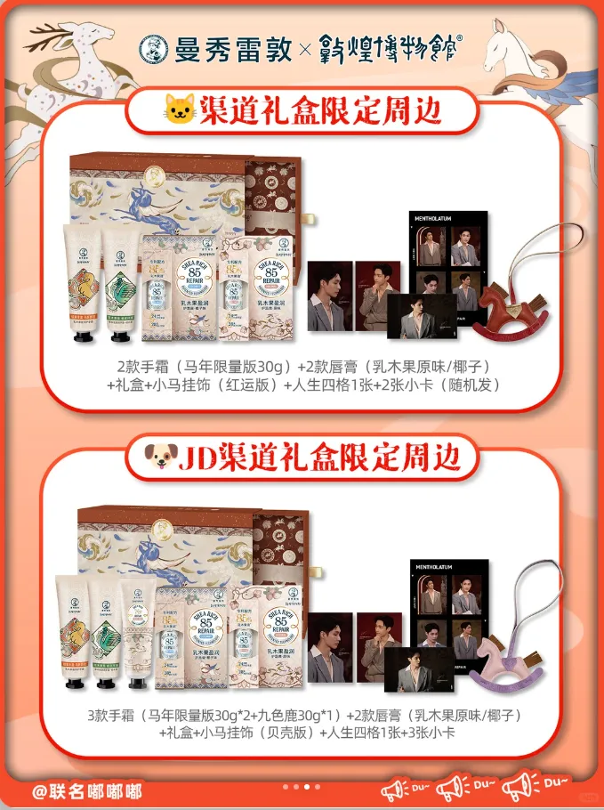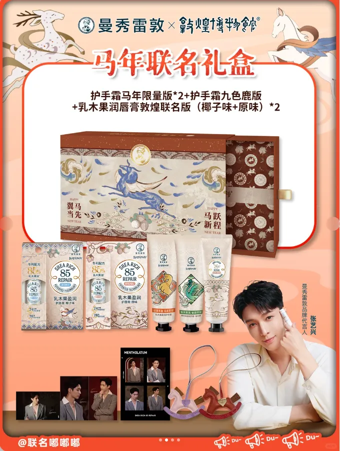 1.9与敦煌博物馆推出张艺兴马年联名礼盒,133.9元/套(2款手霜+2款唇膏),天猫与京东附赠不同颜色周边小马挂饰,均含代言人小卡和人生四格。