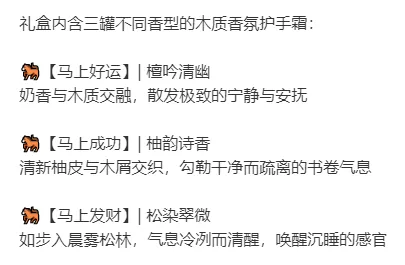 1.6推出马年限定香氛护手霜礼盒,180元/套(45g×3罐),三款均为木质调。