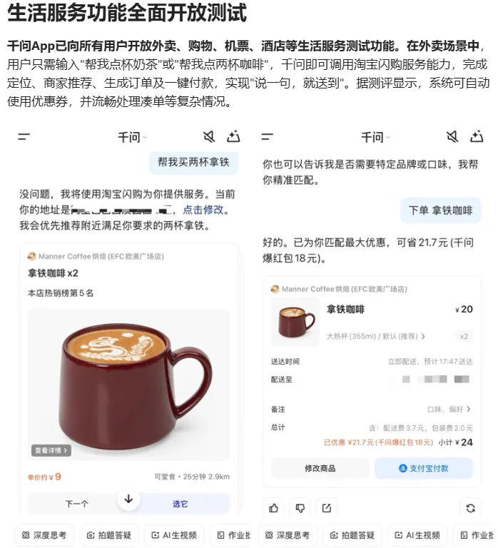 1.15千问App宣布全面接入淘宝、支付宝、淘宝闪购、飞猪、高德等阿里生态业务,用户可在APP内实现点外卖、买东西、订机票等AI购物功能。