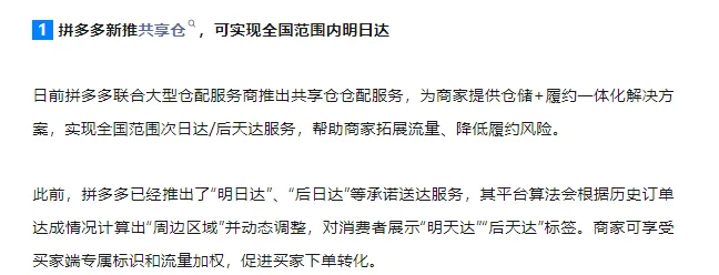 ② 拼多多新推共享仓,可实现全国范围内明日达;