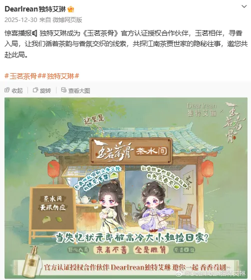 【独特艾琳】 12.30官宣为古装电视剧《玉茗茶骨》的官方认证授权合作伙伴,主演为侯明昊;1.20官宣与电视剧联名香氛「空山雪茶」清雅上市,新香同时延展至沐浴露(350ml/79元)、洗手液(290g/59元)、护手霜(35ml/35元)以及精油皂(50g/19.9元)