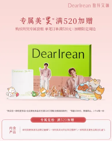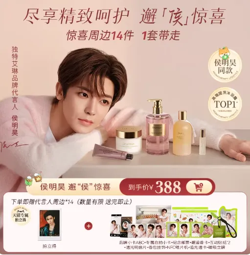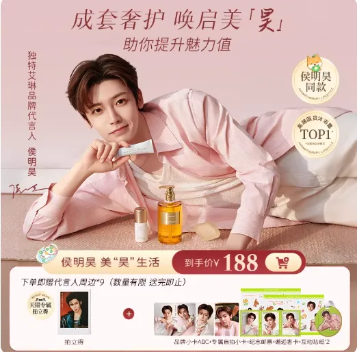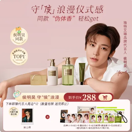 【独特艾琳】 1.21官宣侯明昊为代言人,套组覆盖各个价位段188/288/388元,天猫满520加赠;套组中跨品类覆盖沐浴露+身体乳/身体精华油+手霜/手部精华油+精油皂/香体露。目前在售套装香味均为热卖香味(浮靡之水、你最珍桂),未见新香空山雪茶