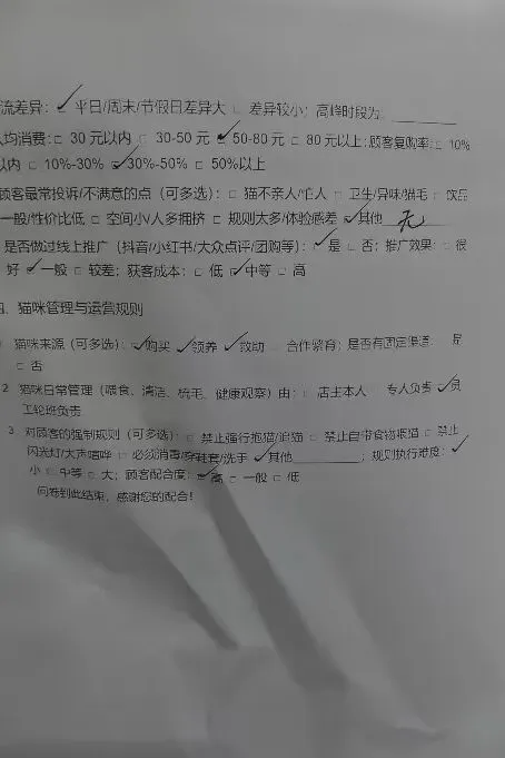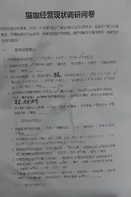 1.问卷调研与数据整理:面向猫咖经营者发放调研问卷,重点了解经营时长、主营模式、营收状况及发展困境,累计回收有效问卷并完成数据统计分析。
