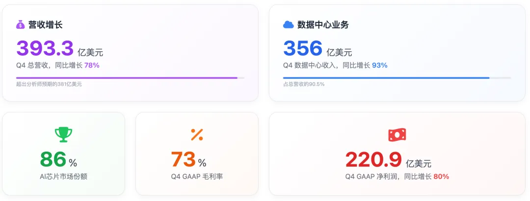 - 净利润:GAAP净利润429.6亿美元,同比激增94%,盈利增速跑赢营收,赚钱能力再升级;