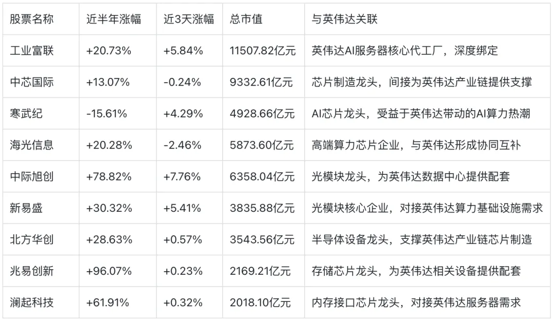 关键亮点补充:黄仁勋在财报电话会上明确表示,代理式AI(可自主完成任务的智能体)拐点已至,企业对智能体的采用率飙升,“有用的token正在产生,AI计算就是收入”。同时披露,英伟达2027财年将同步推进Blackwell与Rubin双架构芯片,GB300产品占Blackwell收入的2/3,Rubin芯片将于2026年下半年开始放量,进一步巩固算力霸权。此外,英伟达接近与OpenAI达成新投资协议,同时引入Groq技术提升AI基础设施性能,生态壁垒持续扩大,这也是其长期领跑的核心底气之一。二、核心股票涨幅曝光:近半年+年后表现,一目了然