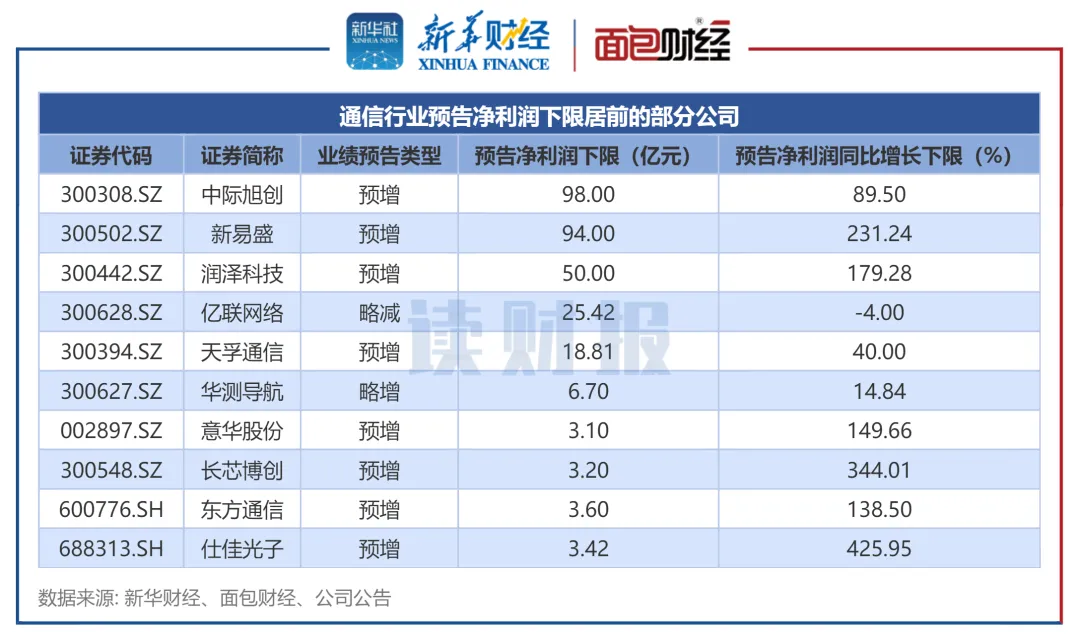 以业绩预告净利润同比变动下限统计,超五成公司通信行业上市公司实现利润增长。其中,仕佳光子净利润同比增长下限最高。