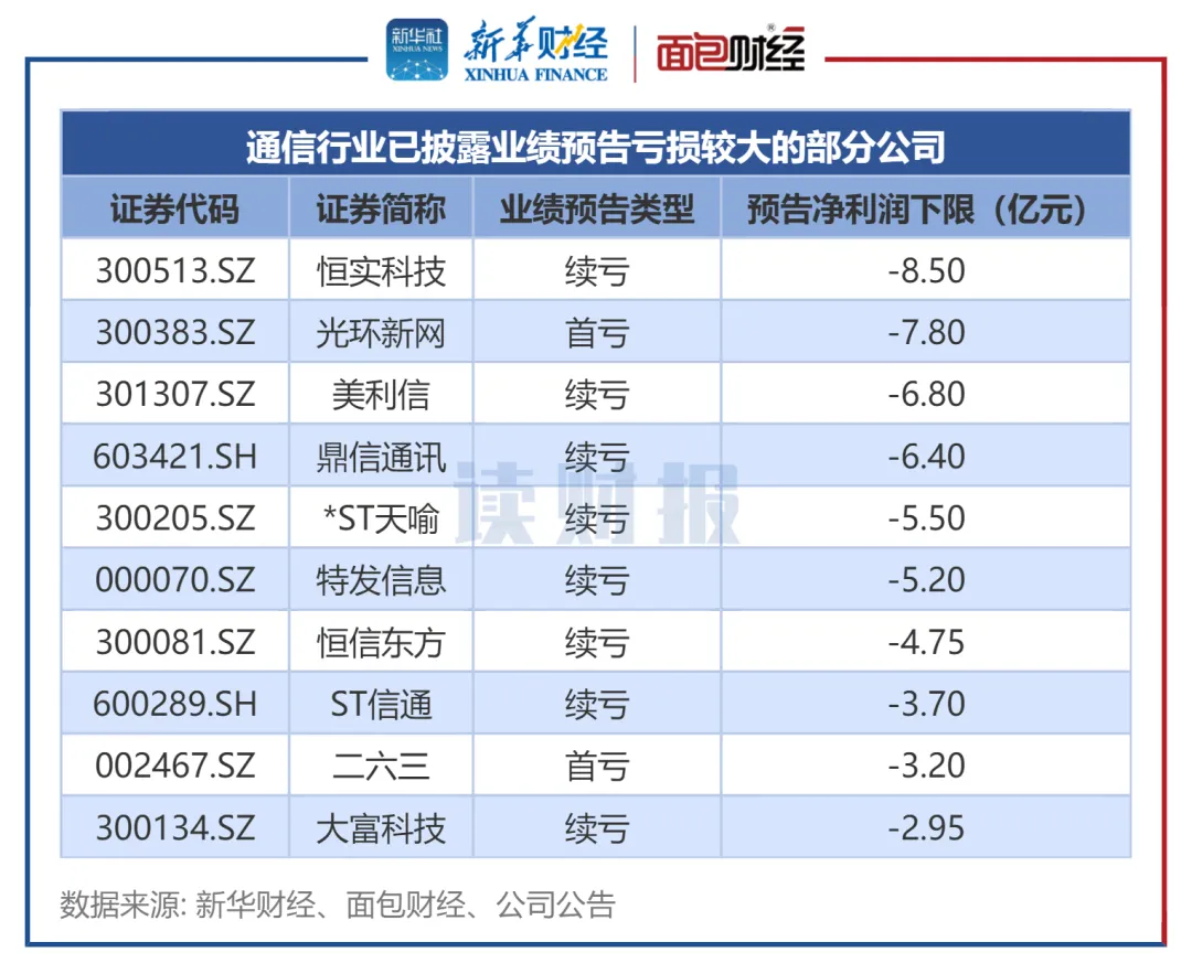 统计数据显示,通信行业已公布业绩预告的公司中,预告净利润亏损下限排名前三位的公司分别是恒实科技、光环新网及美利信。