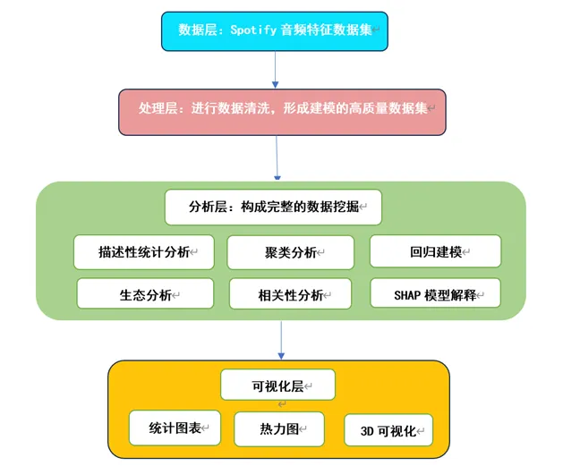 研究的系统架构涵盖数据采集、数据预处理、模型构建与实践应用四大模块,综合采用统计分析机器学习等技术。论文详细阐述通过曲风差异分析、聚类分析揭示了音乐特征的分布规律。