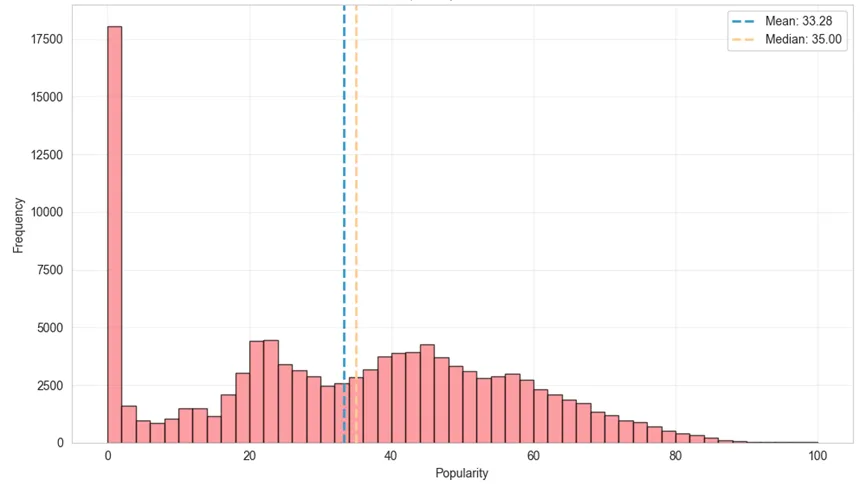 正如如图中所展示的那样,流行度指标在0到100的范围内波动,平均值为33.28,中位数为35,标准差为22.33,显示整体分布偏向中低流行度。具体来看,25% 的歌曲流行度低于17,而 75% 的歌曲流行度低于50,可见大部分音乐的流行度集中在中低水平,高流行度音乐相对较少。