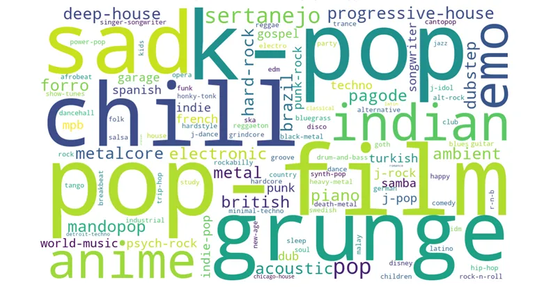 图为各曲风平均流行度词云图,以词语大小和颜色深浅双重维度表征流行度值高低。可视化结果清晰显示,pop、chill、anime等为数据集中的高热度曲风,而folk、jazz、experimental等小众曲风平均流行度偏低。