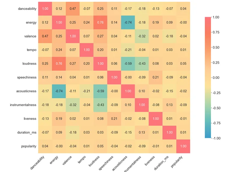 为了探讨音频特征对歌曲流行度的影响,本研究计算了主要音频特征与流行度的皮尔逊相关系数。表中汇总了各特征与流行度的相关系数结果。整体来看,绝大多数音频特征与流行度之间的线性相关性较弱,说明流行度不仅受音频特征影响,还可能受到营销策略、歌手知名度等多种因素的影响。为了直观地呈现各特征之间的关系,本研究绘制了相关性热力图,可以观察不同特征之间的相关模式。