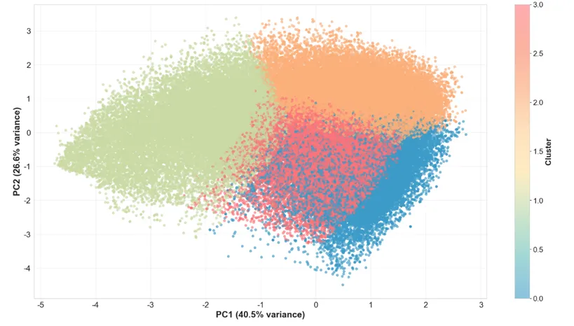 聚类分析的核心目的,是揭示曲风标签背后的底层特征聚合模式——即不同曲风之所以能形成差异化用户认知。基于前面的分析,我们选取了五个关键特征:energy、danceability、valence、tempo、acousticness,并使用K-means聚类算法对数据进行了分组。经过多轮实验,最终选择4个聚类簇作为最优分组方案。