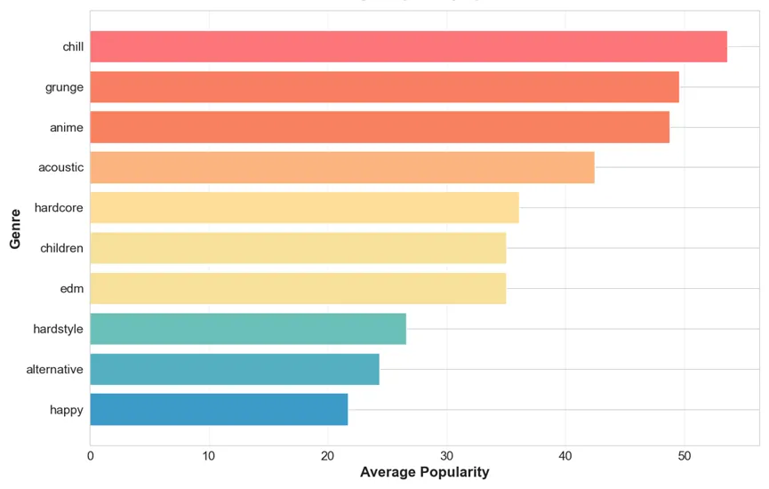 这一分布特性提示,流行度可能受到多种因素影响,音频特征只是其中一部分。流行度的右偏现象也说明在实际音乐市场中,爆款歌曲数量稀少,而大多数作品流行度平平。结合不同曲风的数据,可以进一步分析哪些风格更容易获得高流行度,以及特定特征组合对流行度的潜在影响。