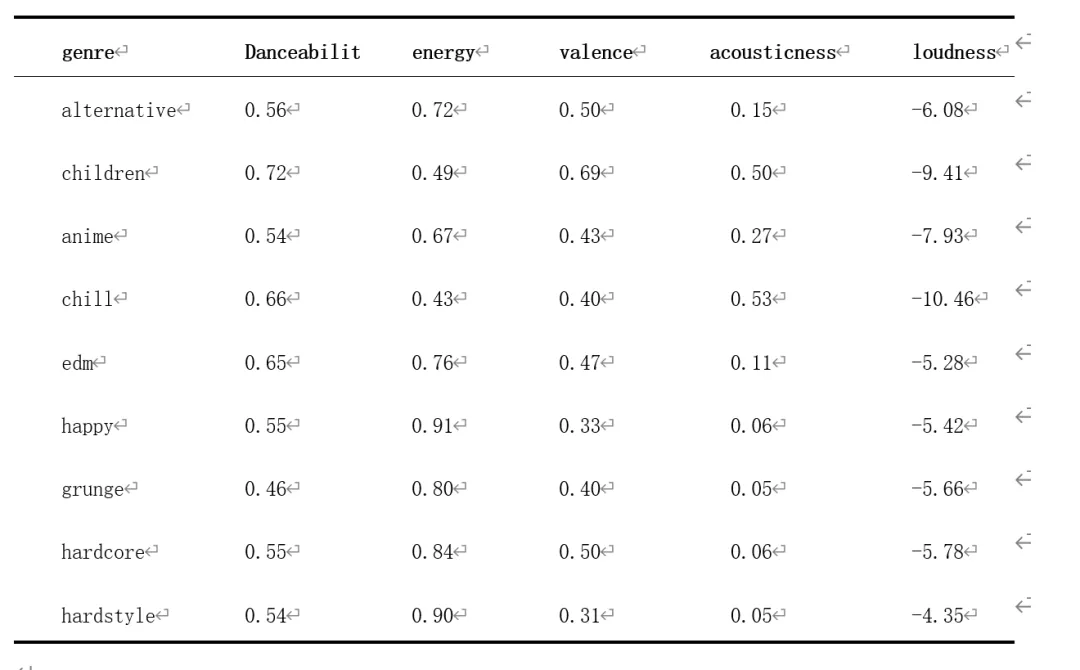 通过曲风–特征–流行度矩阵可以直观地发现,不同曲风在各音频特征维度上的平均流行度存在显著差异。例如,chill曲风在danceability、energy、valence、acousticness以及loudness等维度均表现出最高的平均Popularity(53.65),显示其在音乐市场中具有明显的生态位优势。这与前述描述性统计结果中的 Popularity 分布一致:在 Top 5 流行度均值曲风中,chill曲风同样位列首位(平均流行度53.65),而 grunge、anime 等曲风次之,说明不同曲风的市场表现具有稳定性。