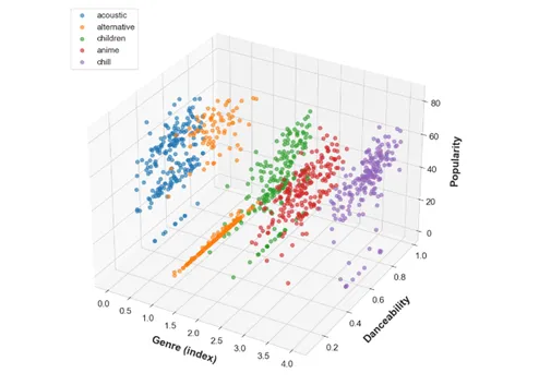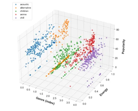 为了进一步揭示不同曲风在关键音频特征上的结构性差异,并探索特征对流行度影响的潜在非线性关系,本研究引入三维散点图(3D Scatter Plot)对数据分布进行空间化表达。与前述的热力图相比,三维图不仅呈现“平均水平差异”,更展示了样本在特征维度上的真实离散结构,使得我们能够观察到不同曲风在某些特征维度上是否形成簇状、带状或梯度式分布。