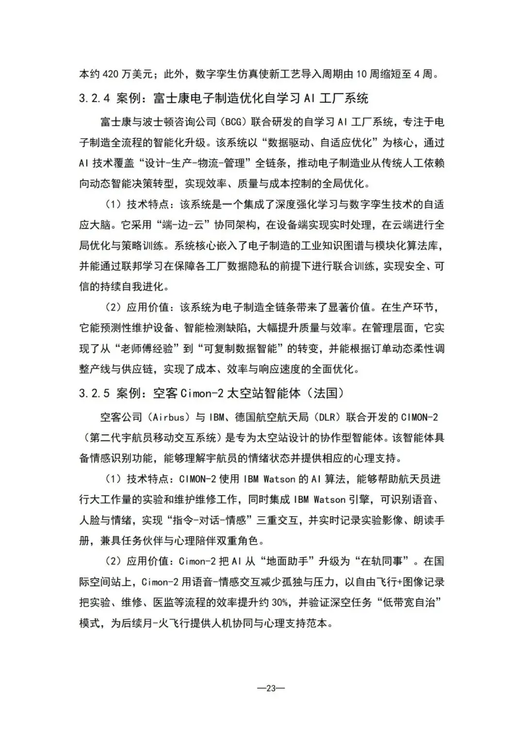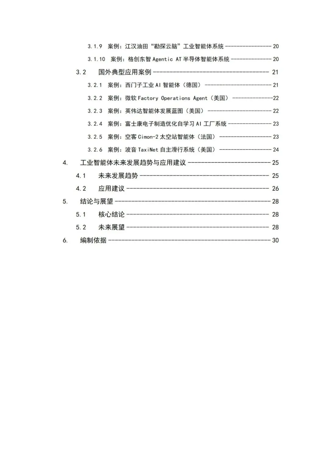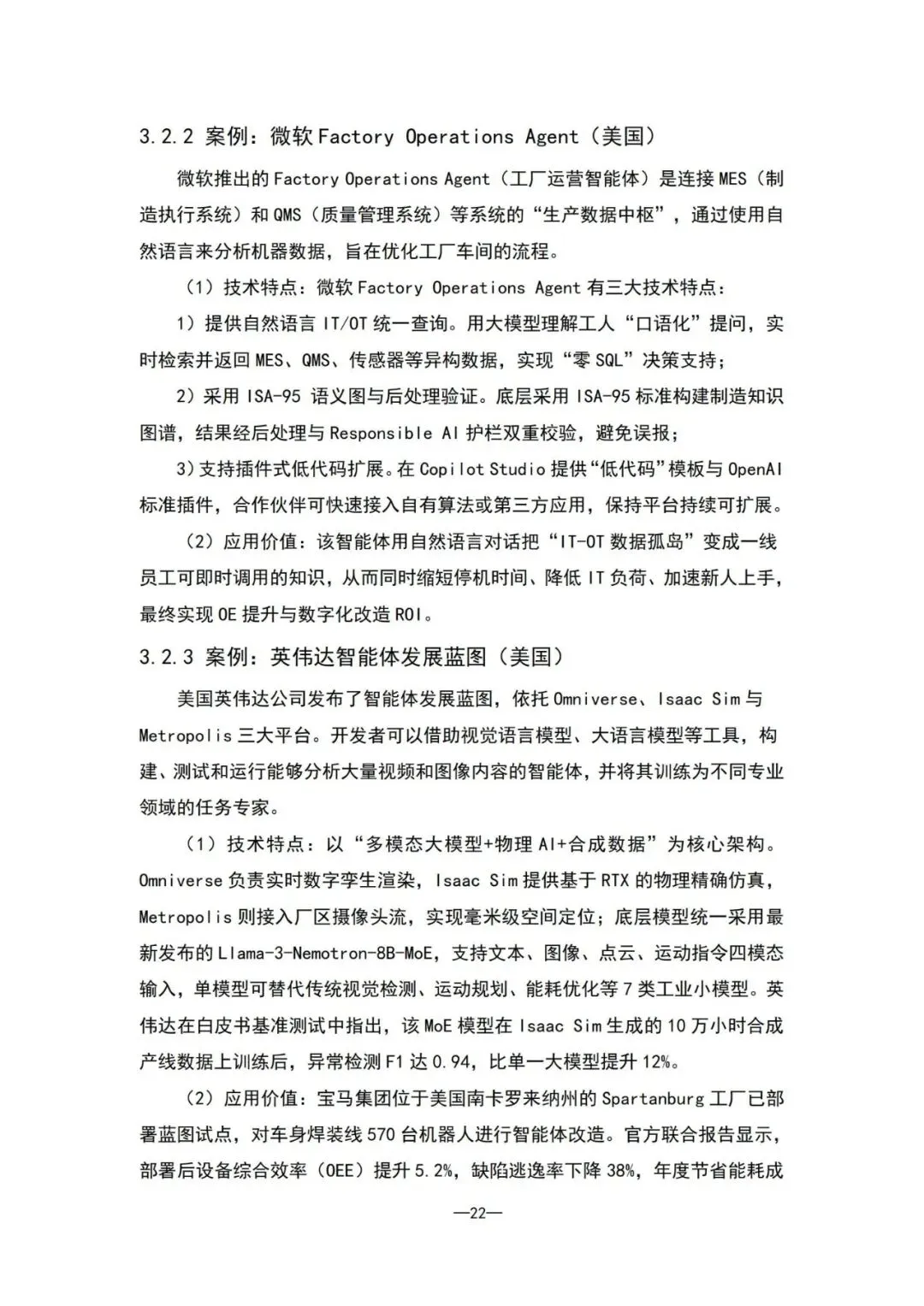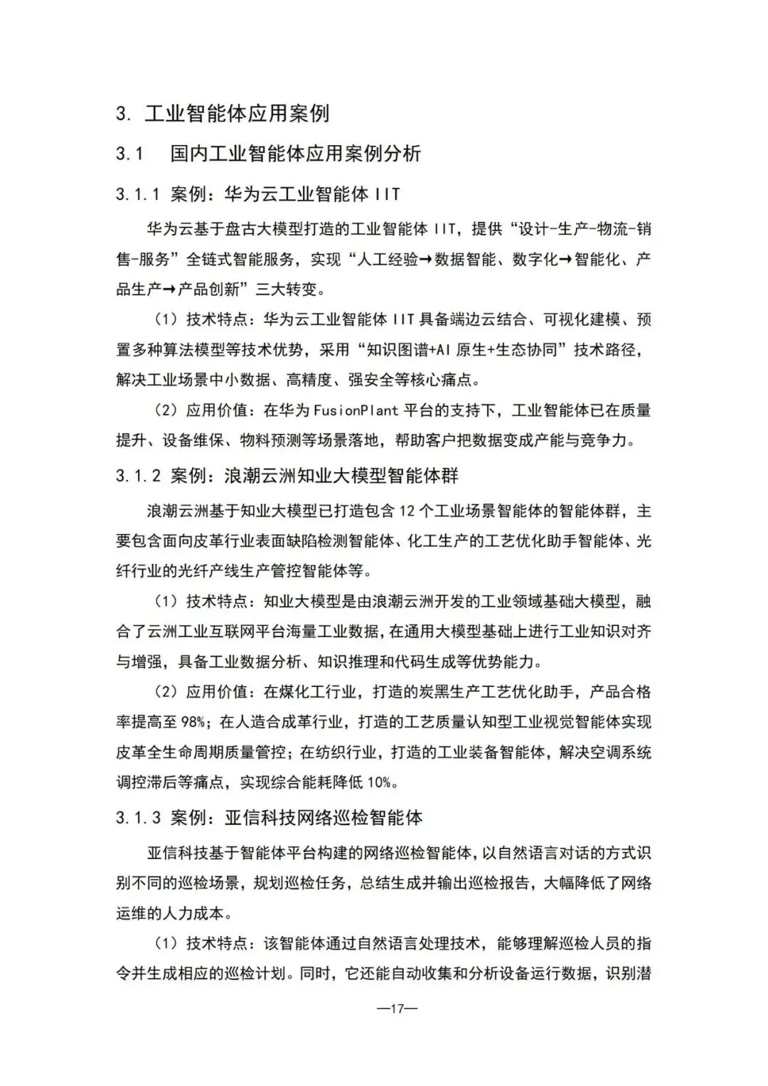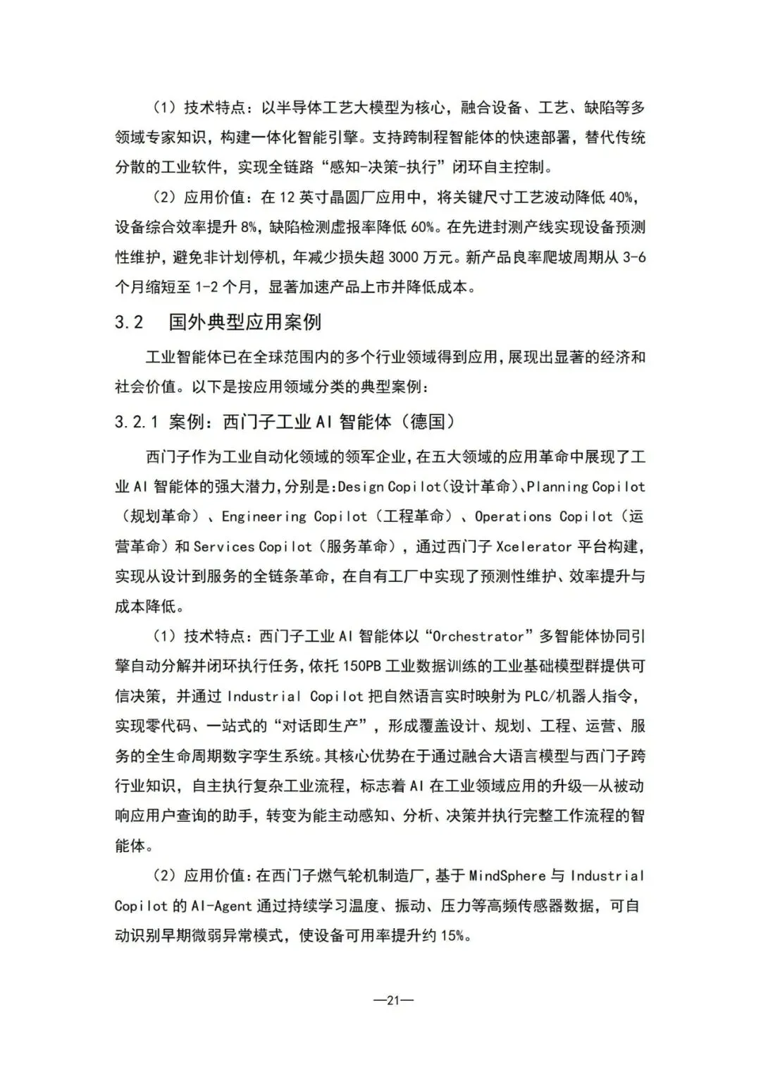 国内工业智能体应用案例分析:包括华为云工业智能体IIT(基于盘古大模型,提供全链式智能服务,具备端边云结合等技术优势,在质量提升等场景落地)、浪潮云洲知业大模型智能体群(基于知业大模型打造12个工业场景智能体,在煤化工等行业提升产品合格率等)、亚信科技网络巡检智能体(以自然语言对话识别巡检场景等,提升巡检效率等)、用友制造智能体(依托精智平台,实现多种模式创新,提升设备利用率等)、广域铭岛“Geega工业AI应用平台+工业智造超级智能体”(通过数据标准化等构建全链路智能决策网络,节省人力成本等)、广东智用Agent Foundry智能体制造平台(基于大模型应用开发范式,实现工业设计周期压缩等)、研华科技WISE-AI Agent智能体平台(包括三大核心服务,应用于多个场景)、中控技术TPT2大模型+智能体系统(以MoE混合专家模型为中枢,在多个客户装置上应用节约成本)、江汉油田“勘探云脑”工业智能体系统(以地质工程一体化大模型为智能中枢,提升储层钻遇率等)、格创东智Agentic AT半导体智能体系统(以半导体工艺大模型为智能中枢,降低工艺波动等)。国外典型应用案例:有西门子工业AI智能体(德国,实现从设计到服务全链条革命,提升设备可用率)、微软Factory Operations Agent(美国,连接相关系统优化工厂流程,缩短停机时间等)、英伟达智能体发展蓝图(美国,依托三大平台构建智能体,提升OEE等)、富士康电子制造优化自学习AI工厂系统(集成深度强化学习等技术,优化生产等环节)、空客Cimon-2太空站智能体(法国,具备情感识别功能,提升太空任务效率)、波音TaxiNet自主滑行系统(美国,实现飞机自主滑行,缩短滑行时间等)。工业智能体未来发展趋势与应用建议