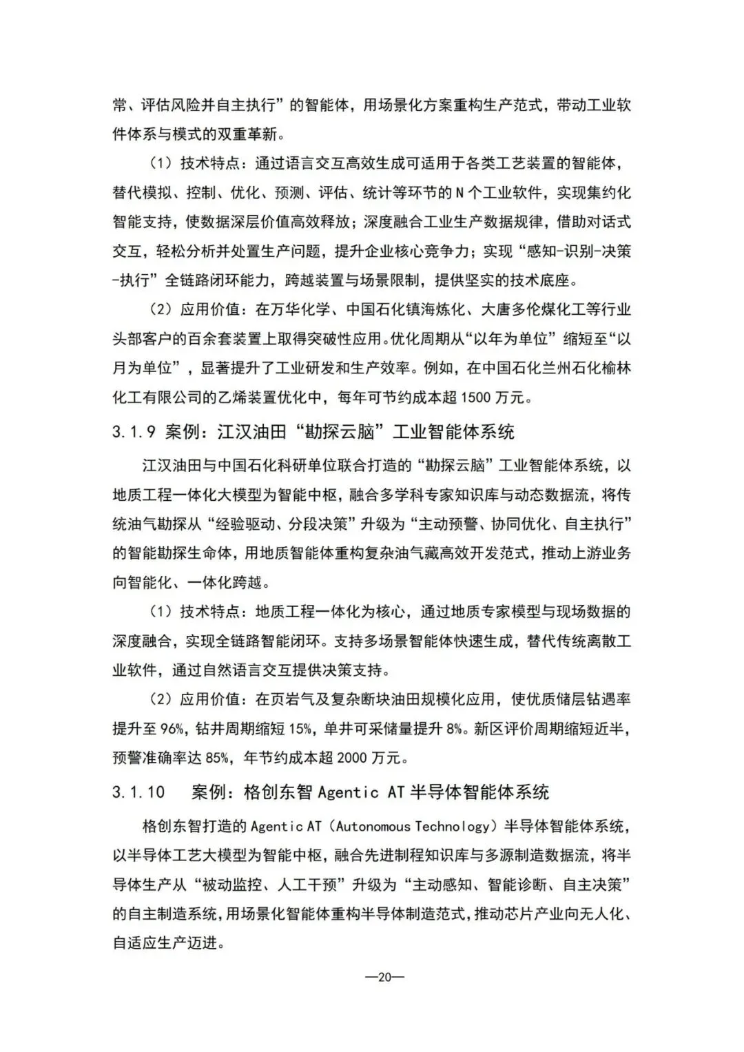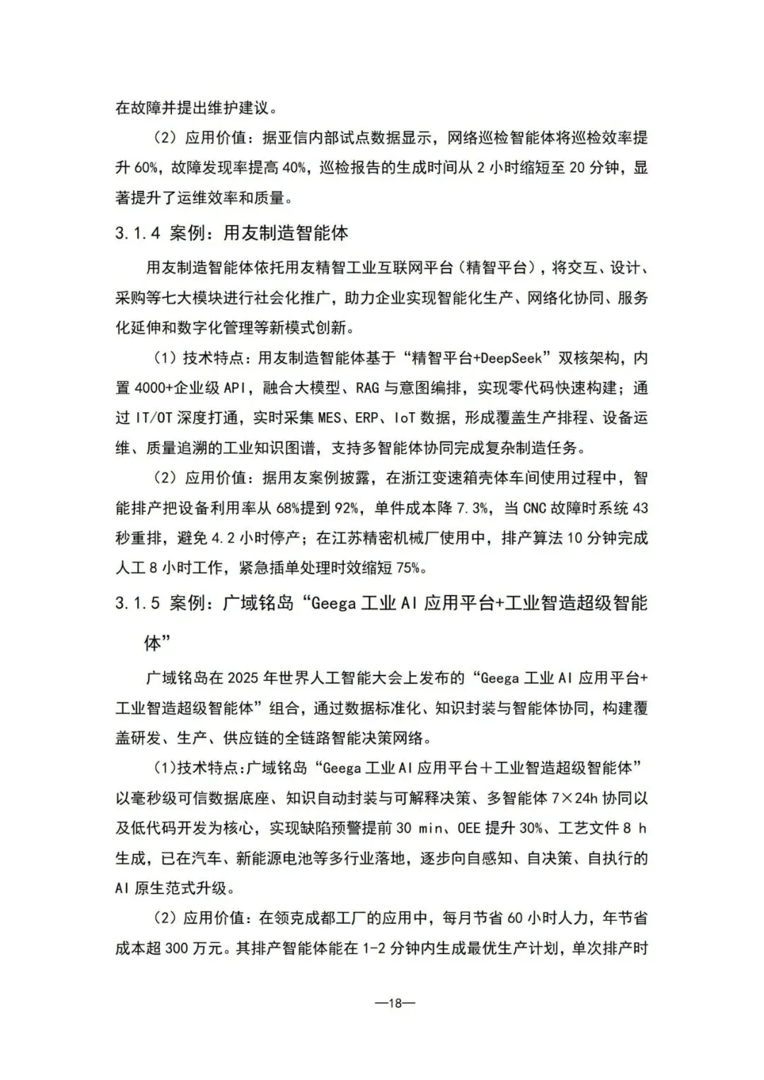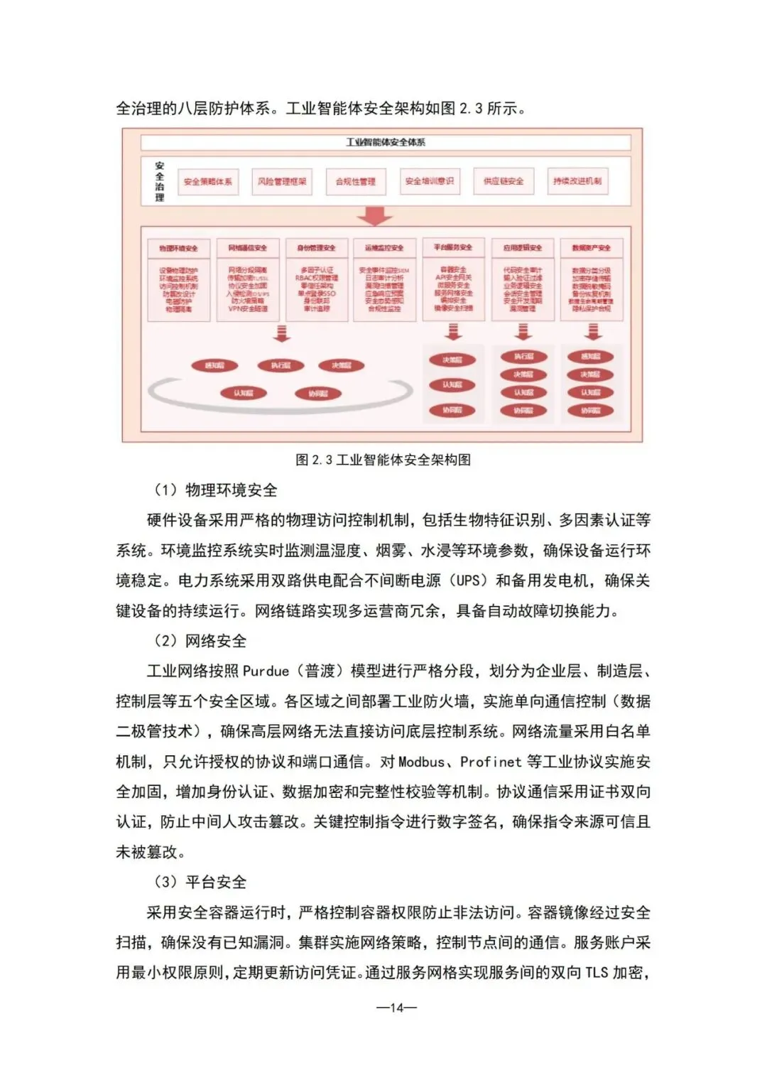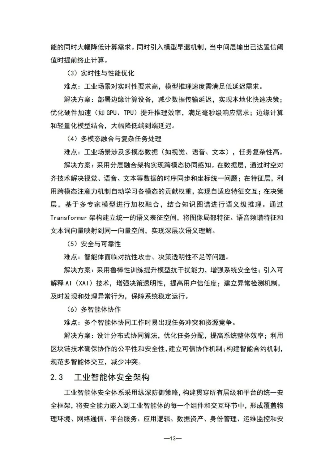 工业智能体业务架构:代表工业生产从“经验驱动”到“数据与智能驱动”转变,融合技术能力与业务流程等。包括业务场景层(定义核心业务问题,如预测性维护等)、角色与触点层(各类用户及交互界面方式,含业务角色和触点交互渠道)、智能体能力层(由领域智能体和协同智能体构成)、业务服务与流程层(封装能力为标准化服务并嵌入流程,含多种服务和闭环流程)、数据与知识层(数据资产整合全域数据,知识层结构化沉淀各类知识库)、集成与治理层(保障稳定安全运行,含系统集成和运营治理)。工业智能体技术架构及关键技术:技术架构采用分层设计,包括感知层(“眼睛”“耳朵”,负责数据采集和环境感知,依赖物联网等技术)、认知层(“大脑”,处理分析数据构建信息模型等,运用机器学习等技术)、决策层(“意识中枢”,生成决策方案,通过强化学习等实现)、执行层(“手脚”,将决策转化为操作,借助RPA等技术)、协同层(“社交网络”,支持多智能体协同,通过消息中间件等实现)、数据流引擎(数据总线,负责数据实时流动)、管理平台(提供操作界面,含智能体管理等功能)。关键技术有感知与连接技术(工业物联网平台、机器视觉等)、认知与决策技术(机器学习/深度学习、知识图谱等)、执行与控制技术(可编程逻辑控制器/机器人控制器等)、协同与集成技术(数字孪生、多智能体系统等)、平台与支撑技术(云边端协同计算、微服务与容器化等)。关键技术难点与解决方案:面临数据(噪声、缺失等问题)、模型设计与优化(精度与资源平衡)、实时性与性能(低延迟需求)、多模态融合与复杂任务处理(多模态数据及高复杂性任务)、安全与可靠性(对抗性攻击等)、多智能体协作(任务冲突等)等难点。解决方案包括采用数据清洗等提升数据质量,“分层优化、动态适配、知识融合”解决模型问题,部署边缘计算等保障实时性,采用分层融合架构处理多模态任务,采用鲁棒性训练等增强安全可靠性,设计分布式协同算法等优化多智能体协作。工业智能体安全架构:采用纵深防御策略,构建八层防护体系。物理环境安全(硬件物理访问控制等)、网络安全(网络分段等)、平台安全(安全容器运行时等)、应用安全(软件开发全生命周期嵌入安全活动等)、数据安全(分级保护策略等)、身份与访问管理(严格验证访问请求等)、安全运维(部署SIEM系统等)、安全治理层(建立管理体系等)。工业智能体应用案例