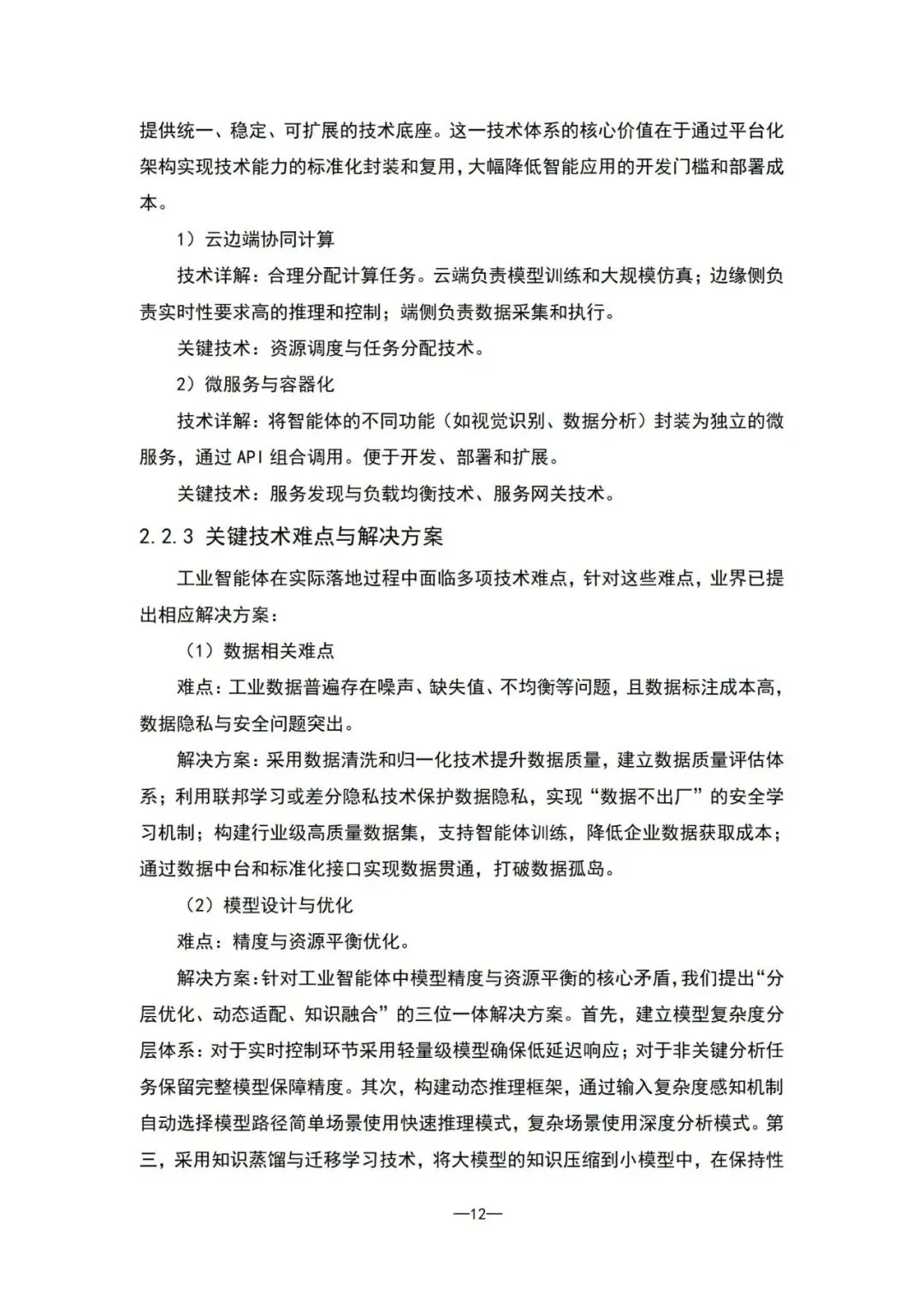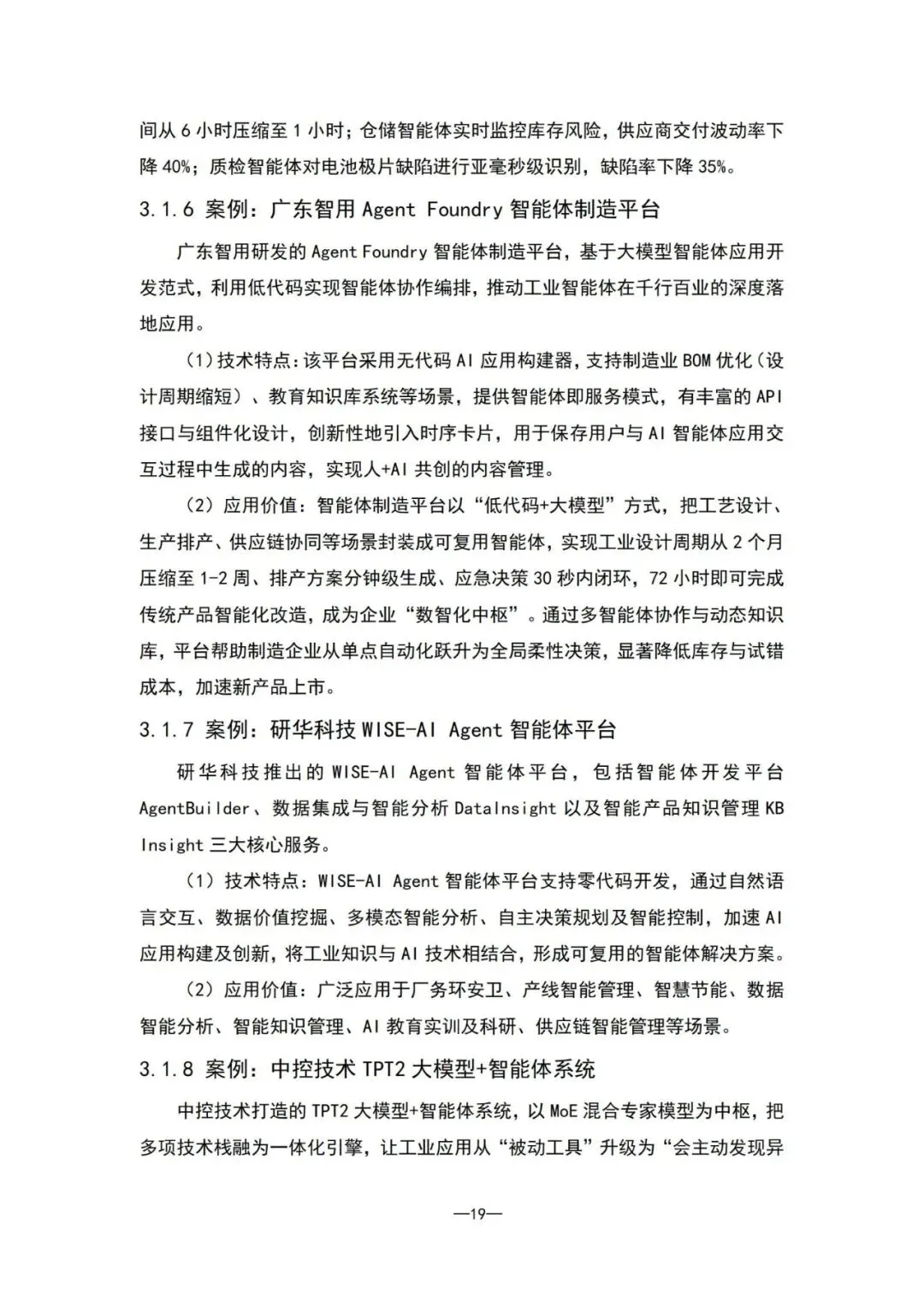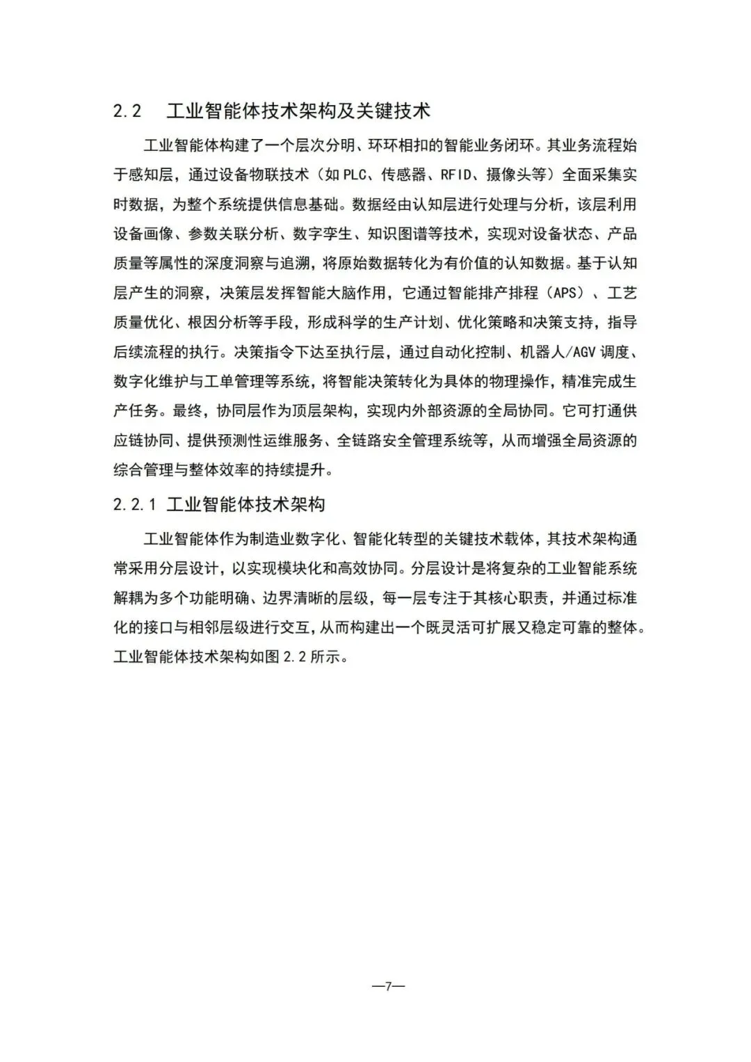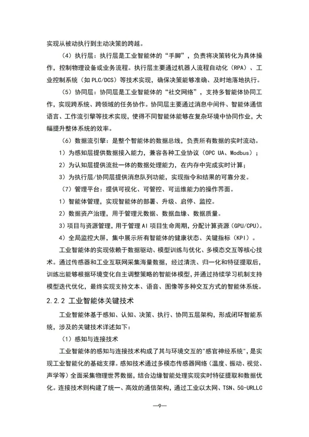 工业智能体业务架构:代表工业生产从“经验驱动”到“数据与智能驱动”转变,融合技术能力与业务流程等。包括业务场景层(定义核心业务问题,如预测性维护等)、角色与触点层(各类用户及交互界面方式,含业务角色和触点交互渠道)、智能体能力层(由领域智能体和协同智能体构成)、业务服务与流程层(封装能力为标准化服务并嵌入流程,含多种服务和闭环流程)、数据与知识层(数据资产整合全域数据,知识层结构化沉淀各类知识库)、集成与治理层(保障稳定安全运行,含系统集成和运营治理)。工业智能体技术架构及关键技术:技术架构采用分层设计,包括感知层(“眼睛”“耳朵”,负责数据采集和环境感知,依赖物联网等技术)、认知层(“大脑”,处理分析数据构建信息模型等,运用机器学习等技术)、决策层(“意识中枢”,生成决策方案,通过强化学习等实现)、执行层(“手脚”,将决策转化为操作,借助RPA等技术)、协同层(“社交网络”,支持多智能体协同,通过消息中间件等实现)、数据流引擎(数据总线,负责数据实时流动)、管理平台(提供操作界面,含智能体管理等功能)。关键技术有感知与连接技术(工业物联网平台、机器视觉等)、认知与决策技术(机器学习/深度学习、知识图谱等)、执行与控制技术(可编程逻辑控制器/机器人控制器等)、协同与集成技术(数字孪生、多智能体系统等)、平台与支撑技术(云边端协同计算、微服务与容器化等)。关键技术难点与解决方案:面临数据(噪声、缺失等问题)、模型设计与优化(精度与资源平衡)、实时性与性能(低延迟需求)、多模态融合与复杂任务处理(多模态数据及高复杂性任务)、安全与可靠性(对抗性攻击等)、多智能体协作(任务冲突等)等难点。解决方案包括采用数据清洗等提升数据质量,“分层优化、动态适配、知识融合”解决模型问题,部署边缘计算等保障实时性,采用分层融合架构处理多模态任务,采用鲁棒性训练等增强安全可靠性,设计分布式协同算法等优化多智能体协作。工业智能体安全架构:采用纵深防御策略,构建八层防护体系。物理环境安全(硬件物理访问控制等)、网络安全(网络分段等)、平台安全(安全容器运行时等)、应用安全(软件开发全生命周期嵌入安全活动等)、数据安全(分级保护策略等)、身份与访问管理(严格验证访问请求等)、安全运维(部署SIEM系统等)、安全治理层(建立管理体系等)。工业智能体应用案例