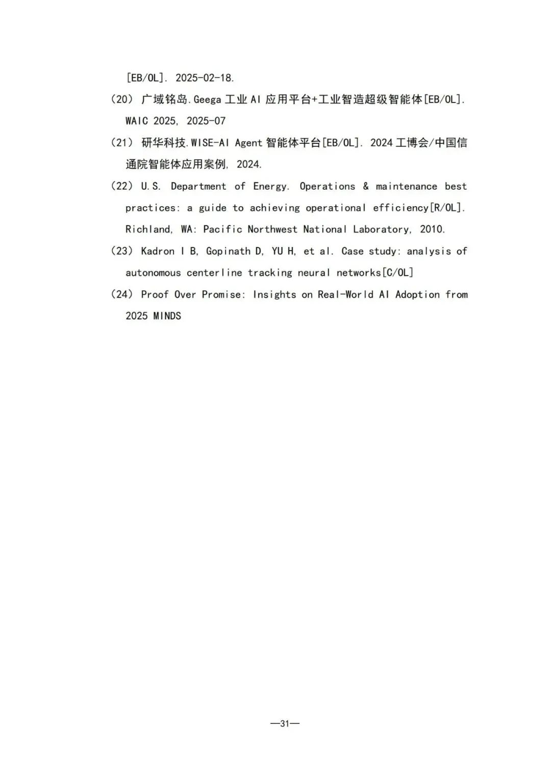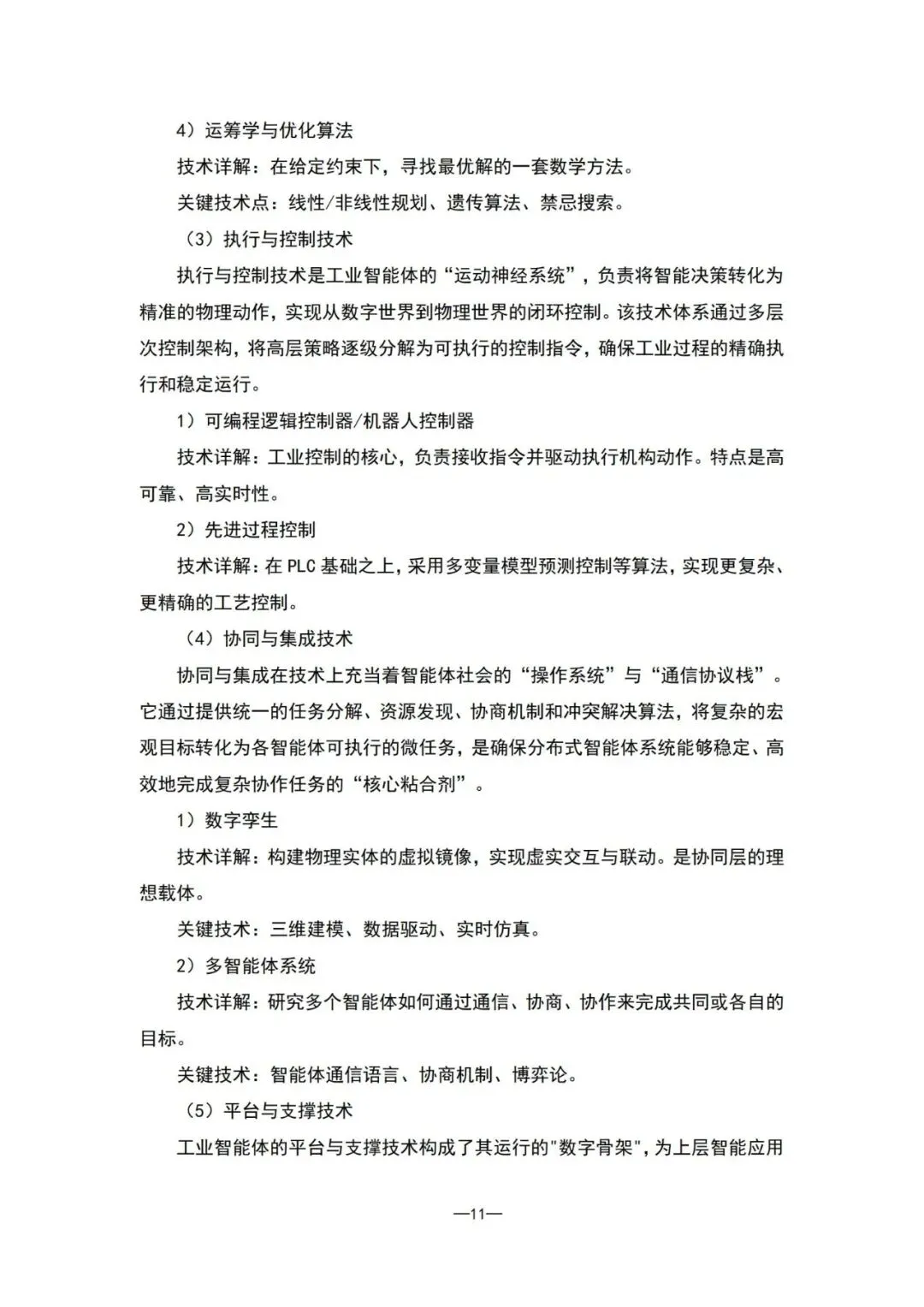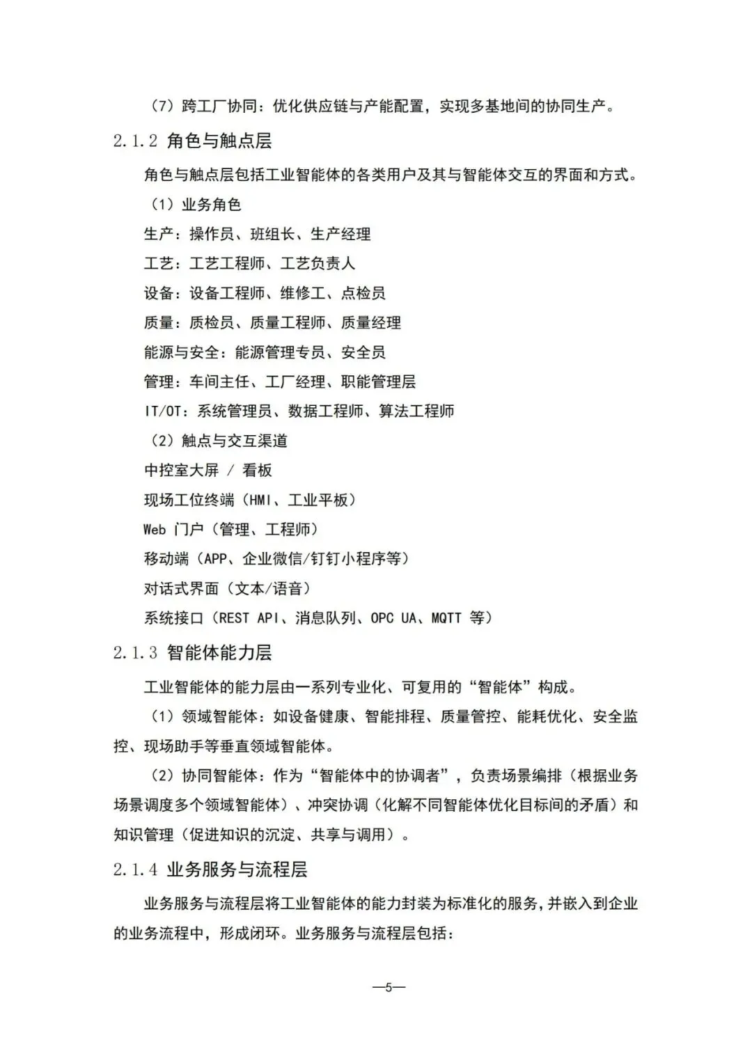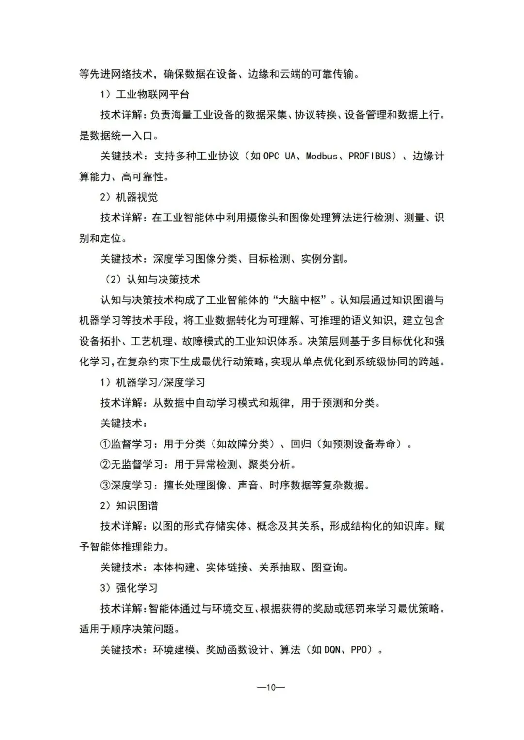 工业智能体业务架构:代表工业生产从“经验驱动”到“数据与智能驱动”转变,融合技术能力与业务流程等。包括业务场景层(定义核心业务问题,如预测性维护等)、角色与触点层(各类用户及交互界面方式,含业务角色和触点交互渠道)、智能体能力层(由领域智能体和协同智能体构成)、业务服务与流程层(封装能力为标准化服务并嵌入流程,含多种服务和闭环流程)、数据与知识层(数据资产整合全域数据,知识层结构化沉淀各类知识库)、集成与治理层(保障稳定安全运行,含系统集成和运营治理)。工业智能体技术架构及关键技术:技术架构采用分层设计,包括感知层(“眼睛”“耳朵”,负责数据采集和环境感知,依赖物联网等技术)、认知层(“大脑”,处理分析数据构建信息模型等,运用机器学习等技术)、决策层(“意识中枢”,生成决策方案,通过强化学习等实现)、执行层(“手脚”,将决策转化为操作,借助RPA等技术)、协同层(“社交网络”,支持多智能体协同,通过消息中间件等实现)、数据流引擎(数据总线,负责数据实时流动)、管理平台(提供操作界面,含智能体管理等功能)。关键技术有感知与连接技术(工业物联网平台、机器视觉等)、认知与决策技术(机器学习/深度学习、知识图谱等)、执行与控制技术(可编程逻辑控制器/机器人控制器等)、协同与集成技术(数字孪生、多智能体系统等)、平台与支撑技术(云边端协同计算、微服务与容器化等)。关键技术难点与解决方案:面临数据(噪声、缺失等问题)、模型设计与优化(精度与资源平衡)、实时性与性能(低延迟需求)、多模态融合与复杂任务处理(多模态数据及高复杂性任务)、安全与可靠性(对抗性攻击等)、多智能体协作(任务冲突等)等难点。解决方案包括采用数据清洗等提升数据质量,“分层优化、动态适配、知识融合”解决模型问题,部署边缘计算等保障实时性,采用分层融合架构处理多模态任务,采用鲁棒性训练等增强安全可靠性,设计分布式协同算法等优化多智能体协作。工业智能体安全架构:采用纵深防御策略,构建八层防护体系。物理环境安全(硬件物理访问控制等)、网络安全(网络分段等)、平台安全(安全容器运行时等)、应用安全(软件开发全生命周期嵌入安全活动等)、数据安全(分级保护策略等)、身份与访问管理(严格验证访问请求等)、安全运维(部署SIEM系统等)、安全治理层(建立管理体系等)。工业智能体应用案例