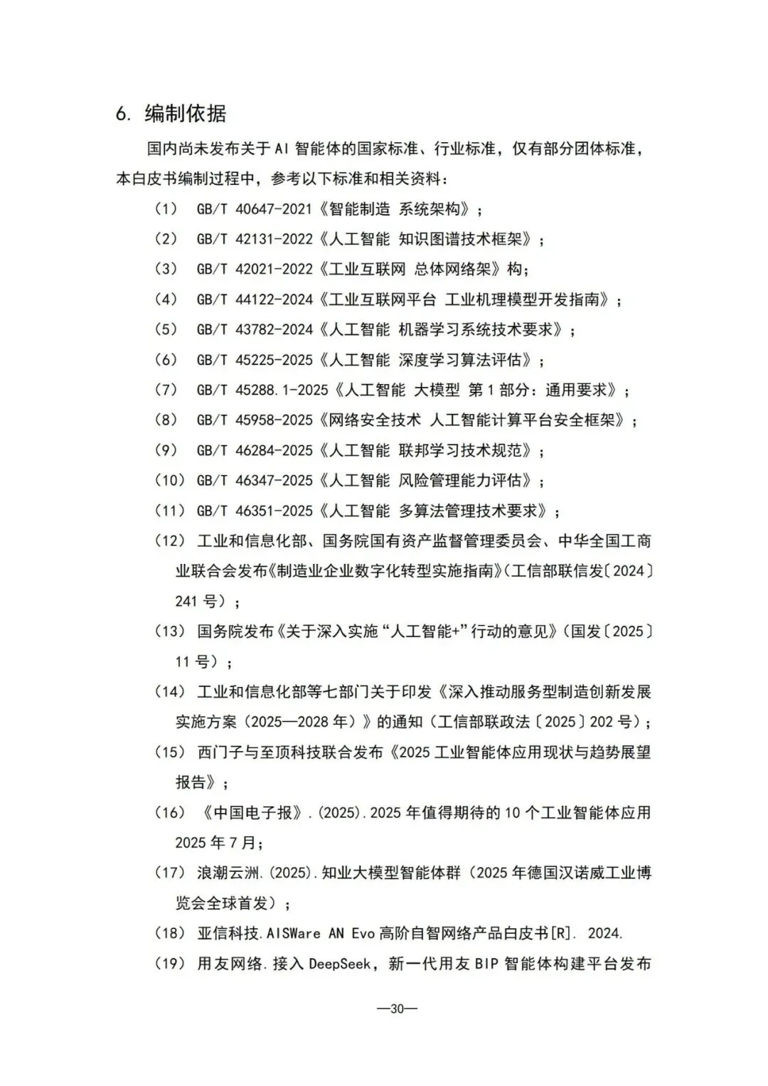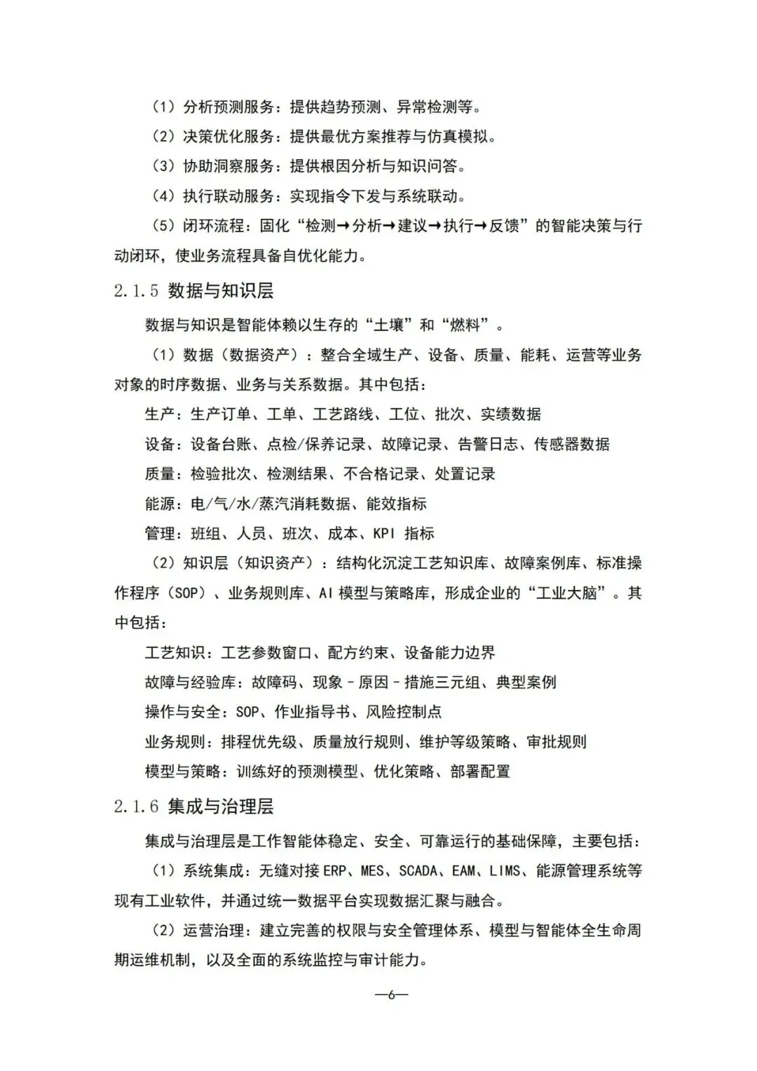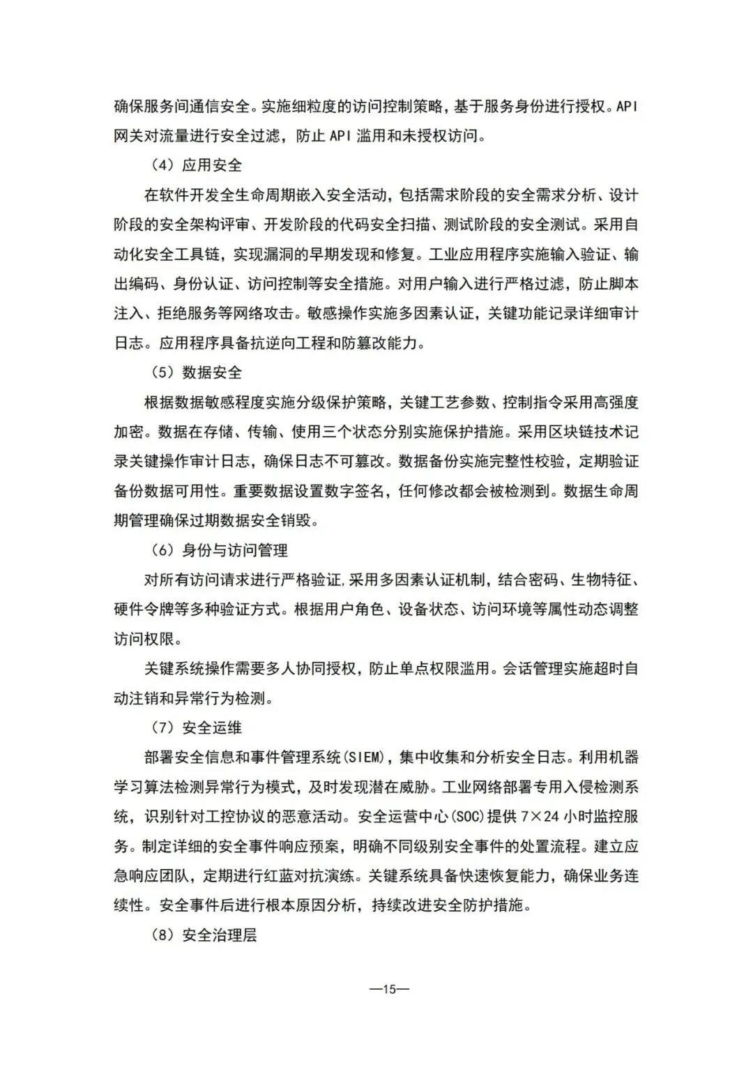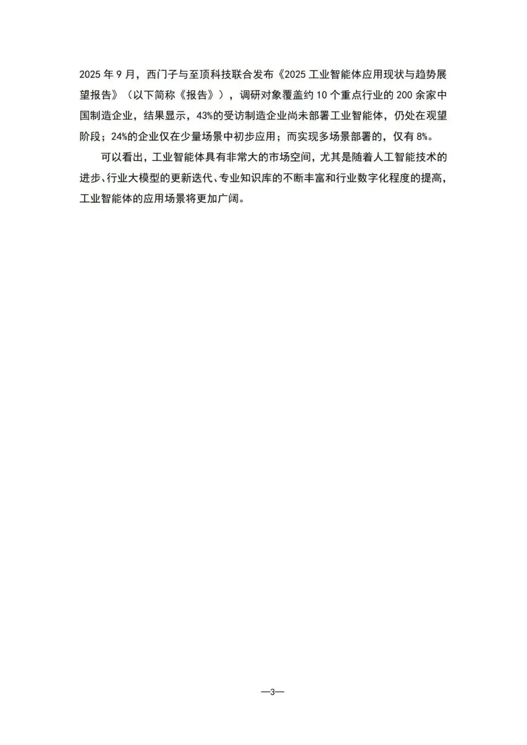 工业智能体业务架构:代表工业生产从“经验驱动”到“数据与智能驱动”转变,融合技术能力与业务流程等。包括业务场景层(定义核心业务问题,如预测性维护等)、角色与触点层(各类用户及交互界面方式,含业务角色和触点交互渠道)、智能体能力层(由领域智能体和协同智能体构成)、业务服务与流程层(封装能力为标准化服务并嵌入流程,含多种服务和闭环流程)、数据与知识层(数据资产整合全域数据,知识层结构化沉淀各类知识库)、集成与治理层(保障稳定安全运行,含系统集成和运营治理)。工业智能体技术架构及关键技术:技术架构采用分层设计,包括感知层(“眼睛”“耳朵”,负责数据采集和环境感知,依赖物联网等技术)、认知层(“大脑”,处理分析数据构建信息模型等,运用机器学习等技术)、决策层(“意识中枢”,生成决策方案,通过强化学习等实现)、执行层(“手脚”,将决策转化为操作,借助RPA等技术)、协同层(“社交网络”,支持多智能体协同,通过消息中间件等实现)、数据流引擎(数据总线,负责数据实时流动)、管理平台(提供操作界面,含智能体管理等功能)。关键技术有感知与连接技术(工业物联网平台、机器视觉等)、认知与决策技术(机器学习/深度学习、知识图谱等)、执行与控制技术(可编程逻辑控制器/机器人控制器等)、协同与集成技术(数字孪生、多智能体系统等)、平台与支撑技术(云边端协同计算、微服务与容器化等)。关键技术难点与解决方案:面临数据(噪声、缺失等问题)、模型设计与优化(精度与资源平衡)、实时性与性能(低延迟需求)、多模态融合与复杂任务处理(多模态数据及高复杂性任务)、安全与可靠性(对抗性攻击等)、多智能体协作(任务冲突等)等难点。解决方案包括采用数据清洗等提升数据质量,“分层优化、动态适配、知识融合”解决模型问题,部署边缘计算等保障实时性,采用分层融合架构处理多模态任务,采用鲁棒性训练等增强安全可靠性,设计分布式协同算法等优化多智能体协作。工业智能体安全架构:采用纵深防御策略,构建八层防护体系。物理环境安全(硬件物理访问控制等)、网络安全(网络分段等)、平台安全(安全容器运行时等)、应用安全(软件开发全生命周期嵌入安全活动等)、数据安全(分级保护策略等)、身份与访问管理(严格验证访问请求等)、安全运维(部署SIEM系统等)、安全治理层(建立管理体系等)。工业智能体应用案例