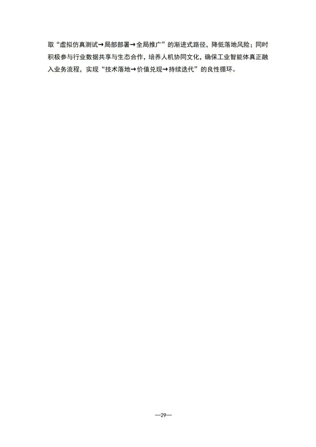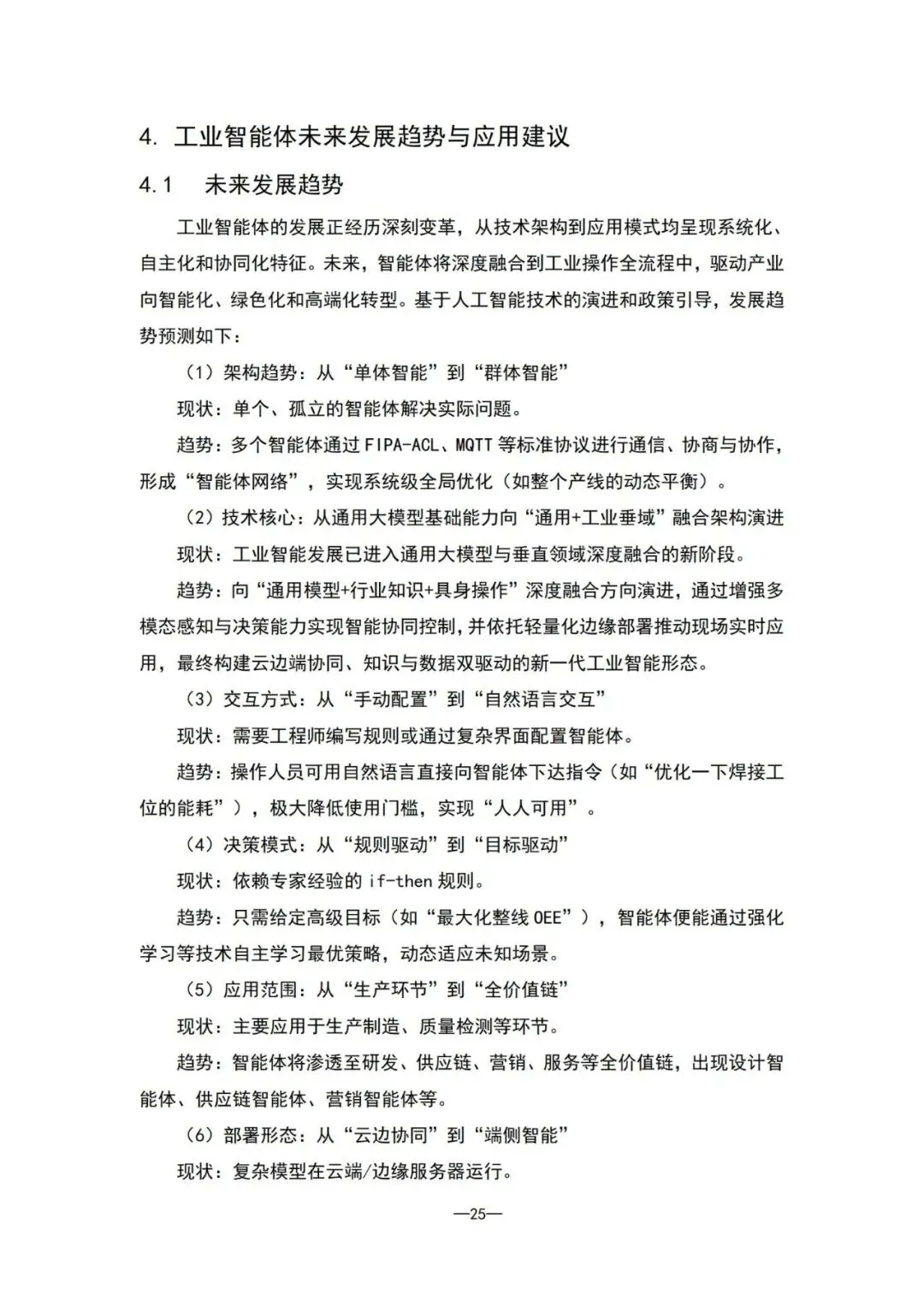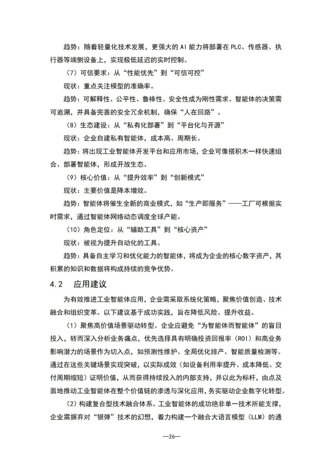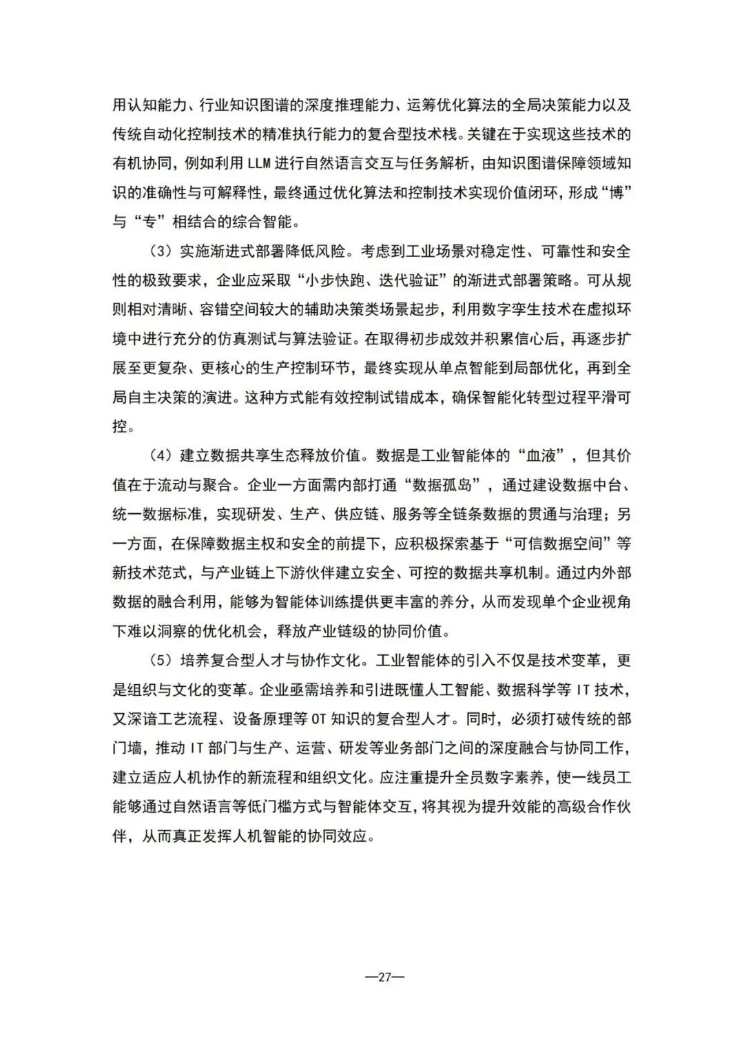 未来发展趋势:架构从“单体智能”到“群体智能”;技术核心从通用大模型基础能力向“通用+工业垂域”融合架构演进;交互方式从“手动配置”到“自然语言交互”;决策模式从“规则驱动”到“目标驱动”;应用范围从“生产环节”到“全价值链”;部署形态从“云边协同”到“端侧智能”;可信要求从“性能优先”到“可信可控”;生态建设从“私有化部署”到“平台化与开源”;核心价值从“提升效率”到“创新模式”;角色定位从“辅助工具”到“核心资产”。应用建议:聚焦高价值场景驱动转型(避免盲目投入,优先选择高ROI场景);构建复合型技术融合体系(融合多种技术形成综合智能);实施渐进式部署降低风险(小步快跑、迭代验证);建立数据共享生态释放价值(打通内部数据孤岛,探索外部数据共享);培养复合型人才与协作文化(培养引进复合型人才,推动部门协同)。结论与展望