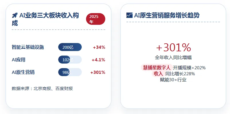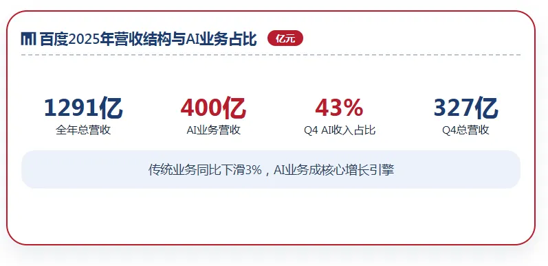 2026年2月26日,百度集团发布了2025年第四季度及全年未经审计财务报告,这份财报被市场视为百度全面展示AI商业化成果的一份关键成绩单。根据财报披露,2025年百度总营收达1291亿元,其中AI业务营收达400亿元;第四季度总营收327亿元,AI业务收入占百度一般性业务收入的43%,这一数字超出市场预期。这一比例的意义远不止于数字本身——它标志着百度收入结构正在发生实质性重构,AI从底层赋能工具,转变为可持续创造现金流的核心引擎。然而,转型并非没有代价。2025年百度总营收同比下滑3%,主要受传统业务收入减少影响。这是百度连续第三个季度营收下滑,凸显其核心广告业务在AI转型过程中面临的挑战。受核心资产组减值损失162亿元的拖累,全年录得运营亏损58亿元,但在剔除减值等影响因素后,非公认会计准则下归属百度的全年净利润达到189亿元。百度创始人李彦宏在财报电话会上表示:“2025年是AI成为百度新核心的关键一年。AI云势头强劲,我们凭借差异化的全栈端到端AI能力赢得越来越多的企业认可。”这份财报清晰地勾勒出百度“一退一进”的战略图景:传统业务收缩带来的营收下滑,被AI新业务的高增长所部分抵消。更重要的是,AI业务已经从过去的“成本中心”走向“利润中心”,资本市场对百度的估值逻辑也正在从传统的市盈率法转向更具前瞻性的分部估值法。正如投行Benchmark将百度目标价上调至215美元时所言,昆仑芯分拆与AI收入清晰化正在重塑百度的价值坐标。二、AI业务三驾马车——智能云、AI应用、原生营销全面解析