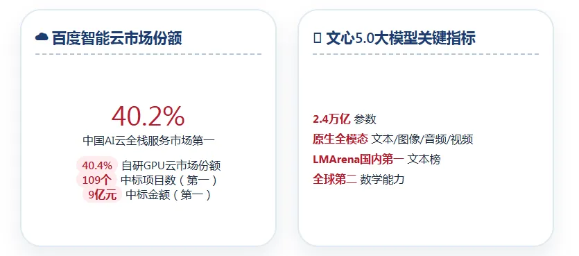 根据百度财报的细分数据,百度核心AI新业务主要由三部分组成:智能云基础设施、AI应用和AI原生营销服务。2025年,这三块业务分别贡献营收约200亿元、102亿元和98亿元,合计达400亿元。其中,智能云基础设施收入同比增长34%,AI原生营销服务收入同比暴涨301%,AI应用全年收入突破100亿元。智能云的强劲增长得益于AI高性能计算设施的爆发。第四季度,AI高性能计算设施的订阅收入同比增长143%,较第三季度的128%进一步加速。据赛迪顾问发布的最新报告显示,2025年上半年中国AI云全栈服务市场规模达280.9亿元,同比增长195.7%,百度智能云凭借从AI基础设施到智能应用的全栈能力,以40.2%的市场份额位居市场首位。Forrester将百度列为中国AI平台的行业领导者,而在自研GPU云市场中,百度智能云同样以40.4%的份额领跑。“2025年是AI成为百度新核心的关键一年。AI云势头强劲,我们凭借差异化的全栈端到端AI能力赢得越来越多的企业认可。”——百度创始人李彦宏