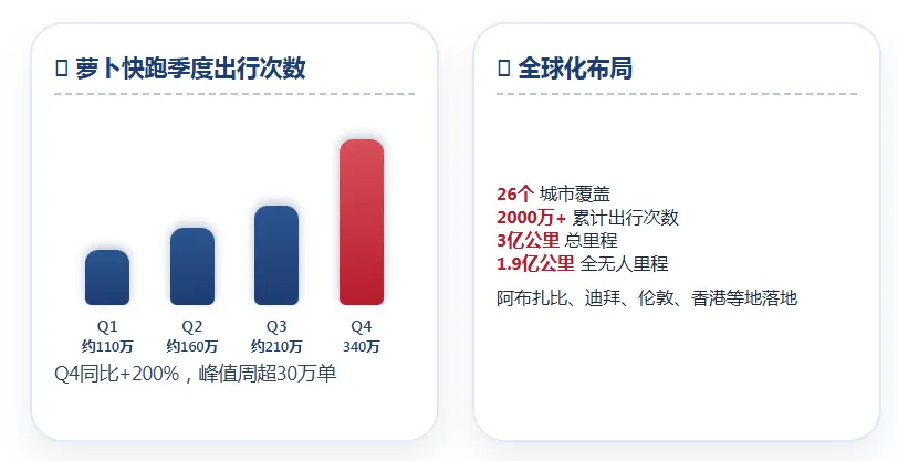 在C端市场,百度AI的渗透率正在快速提升。截至2025年12月,百度App月活用户数达6.79亿,文心助手月活用户数达2.02亿。据百度内部人士透露,春节红包活动启动以来,文心助手月活跃用户同比增长4倍,显示出强有力的用户获取能力。用户增长背后的驱动力是AI应用的真实生产力价值。拥有2000万活跃用户的GenFlow 3.0,无论是数据整理、内容生成还是流程自动化,用户为时间节省支付订阅费用,本质上是对效率溢价的认可。会说话就能做AI应用的理念体现在产品“秒哒”上,通过降低开发门槛,个人创作者与中小企业可以借助自然语言快速生成应用原型,构建面向特定场景的数字化工具,“一人公司”的想象空间被进一步打开。流量的增长并非终点,更重要的是用户在写作、办公、创意生成等真实场景中持续使用,并愿意为高阶功能付费。AI从尝鲜工具变为生产力搭档,使用频率与付费意愿同步提升。这也解释了为何AI原生营销服务能够实现301%的增长——用户在百度生态内的深度交互为精准营销提供了更丰富的数据土壤。五、萝卜快跑——自动驾驶业务的全球化提速