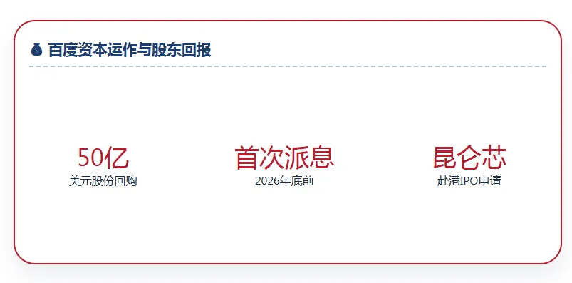 在经营层面兑现AI价值的同时,百度在资本层面也给出更为积极的信号。2026年2月,百度董事会授权一项总额最高达50亿美元的新股份回购计划,有效期至2028年12月31日。同时,百度首次批准采纳普通股的股息政策,首笔股息预计将于2026年底前派发。50亿美元回购相当于百度市值的10%左右,这一比例在全球科技公司中亦属高位。正常而言,苹果、谷歌等现金流强劲的公司回购比例通常只有2%-4%,Meta高点也不过5%,百度接近10%的回购明显超出常规,更像是在用非常规动作表达“公司被低估了”的判断。这种“回购+派息”的组合,被视为管理层对公司长期现金流与AI盈利能力的信心表达。此外,百度正推进旗下芯片业务昆仑芯的分拆及独立上市进程。2026年1月,昆仑芯已向香港联交所提交主板上市申请。昆仑芯的分拆不仅释放AI芯片业务价值,更强化百度“AI+硬科技”双轮驱动叙事,为长期技术投入打开融资通道。七、从兑现阶段走向价值重估
