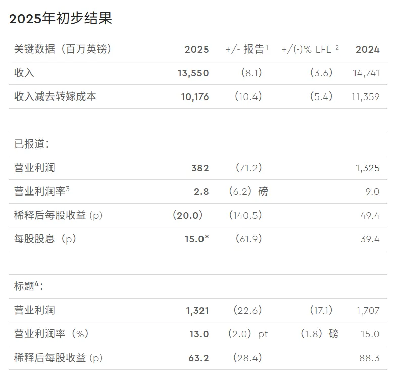 2025年营业利润——核心营业利润为13.21亿英镑,利润率为13.0%(2024年:15.0%),同比下降1.8个百分点。