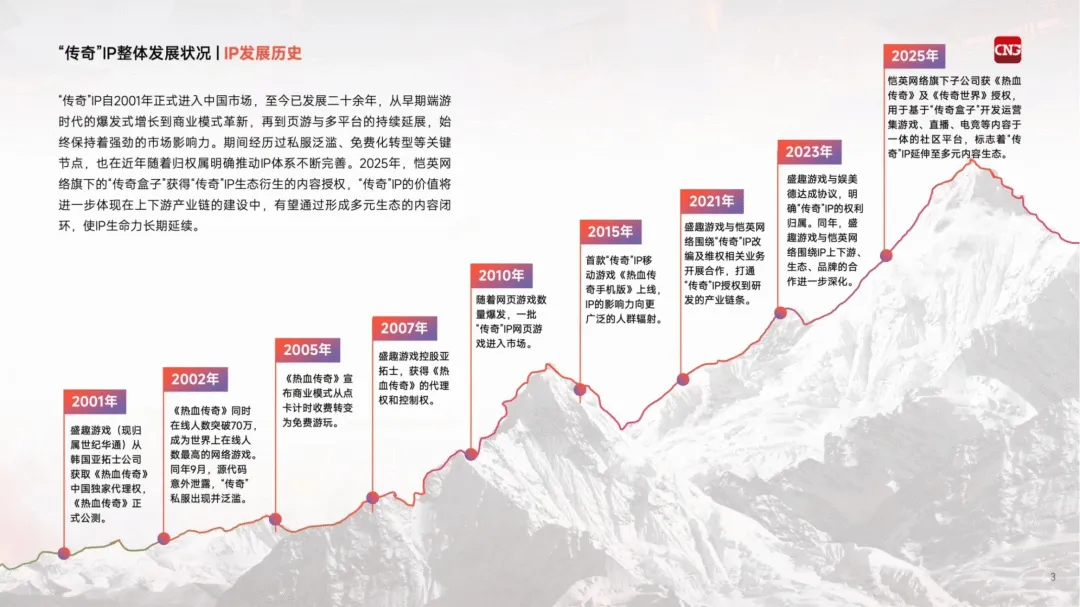 这份报告围绕“传奇”IP展开全维度分析,展现了这一运营超20年的游戏IP的发展现状、核心价值与未来趋势。该IP2001年进入中国后,历经端游爆发、免费化转型、多端拓展等阶段,2023年权属明确后生态持续完善,2025年恺英网络“传奇盒子”获授权,推动IP向多元内容生态延伸,成为国内收入最高的客户端游戏IP之一。