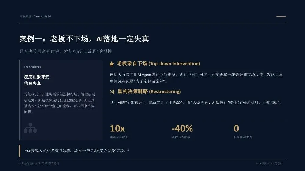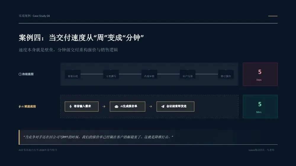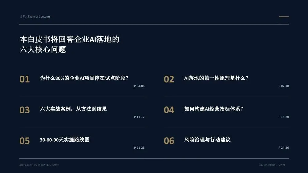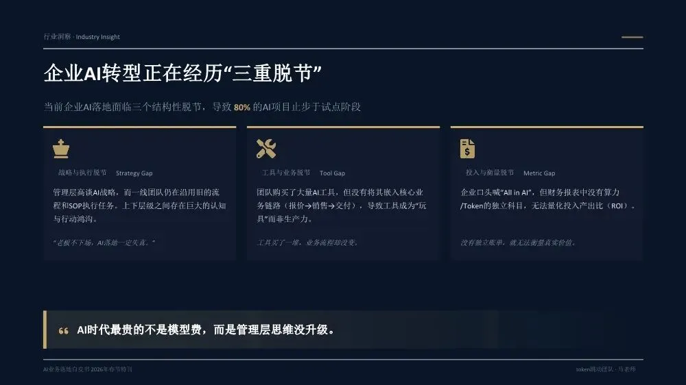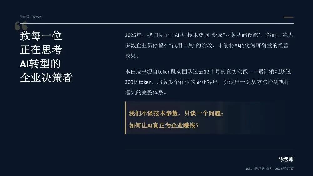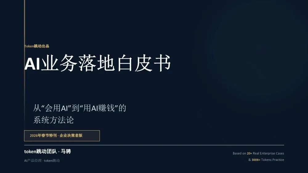 《AI业务落地白皮书(2026年春节特刊)》是一份由Token跳动团队基于20多个真实企业案例和超过300亿Token实践沉淀出的方法论指南,核心目标是帮助企业决策者实现从"会用AI"到"用AI赚钱"的跨越。核心洞察:为什么80%的企业AI项目停在试点阶段?白皮书开篇直指要害——当前企业AI落地面临三重结构性脱节:战略与执行脱节:管理层高谈AI战略,一线团队却仍在用旧流程和SOP执行任务。作者提出一个尖锐观点:"老板不下场,AI落地一定失真。" 这不是技术问题,而是权力重构问题。工具与业务脱节:团队购买大量AI工具,但没有嵌入核心业务链路(报价→销售→交付),工具沦为"玩具"而非生产力。关键诊断:"工具买了一堆,业务流程却没变。"投入与衡量脱节:企业喊"All in AI",但财务报表中没有算力/Token的独立科目,无法量化ROI。"没有独立账单,就无法衡量真实价值。"先划边界:优先列出"AI不能做清单",明确人机分工红线。高层谈判、信任建立、关键决策由人主导;签单后的执行链路交给AI。先定结果:人负责定义结果和验收标准,AI负责推进过程。不要问"AI能做什么",要问"我要什么结果"。结果达标即通过,不纠结过程。先跑首版:允许模糊启动,先让AI产出首版再迭代。"先执行再完美"是AI时代的核心节奏。70%准确度的首版方案,远胜于0%的完美构思。先建系统:将单点成功沉淀为可复用的模板、SOP和指标体系,从"会用AI"升级为"可稳定经营的交付系统"。- Result(结果定义):明确可验收的结果标准,写清楚"做成什么样算合格",而非"做哪些步骤"- AI Run(AI执行):将任务交给AI产出首版,人不参与过程,只在关键节点纠偏- Verify(验证验收):对照结果标准验收,达标即推进,未达标才回溯过程- Iterate(迭代优化):基于差距清单针对性修正,沉淀为可复用模板核心原则:人定义结果,AI推进过程,人对结果负责。过程不必完全可解释,但必须做到输入可追溯、输出可验证、异常可回放。创始人直接使用AI Agent进行业务推演,跳过中间汇报层,发现大量中间流程纯属"为了流程而流程"。成果:决策速度提升10倍,流程节点缩减40%。传统模式需要2周行业调研+方案撰写,AI模式下只需2小时:投喂50+份行业报告给AI生成"行业通识框架"和初步解决方案,作为"敲门砖"启动客户对话,边做边学。语音意图驱动工作流,消除"输入摩擦力"。相比GUI交互(解锁-找APP-点击-打字),语音实现3秒平均启动耗时,任务启动率提升40%,100%结构化数据留存。传统报价流程(需求沟通→方案撰写→内部审批→客户反馈→修订报价)需要5天,AI赋能流程(语音输入需求→AI生成报价单→会议结束即发送)只需5分钟。"当竞争对手还在回公司写PPT时,我们的报价单已在客户邮箱里。"从"人机对话"转向"结果托管":人类只下达目标(如"调研5家竞品并生成对比报告"),Agent自主拆解任务、调用工具、自我修正,直接交付PDF报告或预约成功的会议。核心价值不是"辅助"而是"替代",节省的不仅是时间,更是"心力"。建立Token经营账单,将AI从"IT成本中心"转为"业务投资中心"。例如:销售部方案生成ROI 1:20,每单成本0.8元;客服部自动应答效率提升40%,每次成本0.05元,替代2人力;研发部代码辅助提速30%,每人每月成本150元。- 项目牵头人:对最终业务结果负全责,定义目标与验收标准,协调资源与解决卡点- 数字员工(AI Agent):承担80%执行工作,7×24小时即时响应,零情绪、零遗忘、零偏差- 领域专家/教练:为AI提供专业知识养料,审核AI产出质量,处理AI无法解决的Corner Case三条硬规则:一人负责到底,拒绝"接力棒"式交接;凡是AI能做的,禁止人工介入;专家服务于项目,而非部门。北极星指标(最终业务价值):人均毛利增长、单位交付成本、业务净利润率质量指标(交付标准):AI产出可用率、客户满意度(NPS)、返工率过程指标(执行效率):任务平均耗时、AI工具渗透率、流程节点数经营指标(成本控制):Token/单产出、算力成本占比、工具订阅ROI核心原则:如果AI带来的效率提升(过程指标)不能转化为利润增长(北极星指标),这种"提效"就是伪命题。- 交付结果(权重40%):不再关注"你做了多久",只关注"你交付了什么"- 响应速度(权重20%):AI赋予"即时响应"能力,速度本身就是核心竞争力- 资产复用(权重20%):核心增量指标,员工需将经验沉淀为Prompt或Agent供他人复用- 经营意识(权重20%):考核AI资源利用效率,鼓励用最小Token成本产出最大价值关键洞察:在AI时代,"苦劳"不再是功劳。如果不沉淀资产,每一次工作都是在浪费经验。第1-30天(Ignition):寻找高频痛点,跑通第一个最小闭环。盘点业务全流程,锁定"高频、重复、有痛点"的单一任务,编写优化Prompt,产出可用Demo,记录Token消耗与产出质量,计算初步ROI。交付物:一个被验证可行的AI应用场景+清晰的ROI测算模型。第31-60天:把单点成功扩展为多流程可复制。提取3-5个高频业务场景编写标准Prompt,搭建统一的Prompt库和知识库,选拔内部"AI种子选手"进行传帮带式培训。交付物:3-5个成熟AI业务流+企业级Prompt资产库。第61-90天:将AI纳入正式经营系统。经营并表(Token计入部门COGS,设立AI专项预算),组织固化(设立AI运营官/提示词工程师,建立内部培训与认证体系),系统升级(建立反馈-清洗-微调数据闭环,部署企业级合规网关)。- 数据绝不出境:核心业务数据必须私有化部署或脱敏处理- 决策绝不脱离人:AI仅作为辅助建议者,关键业务决策必须由人最终确认四类核心治理机制:输入围栏(P