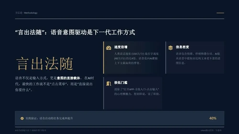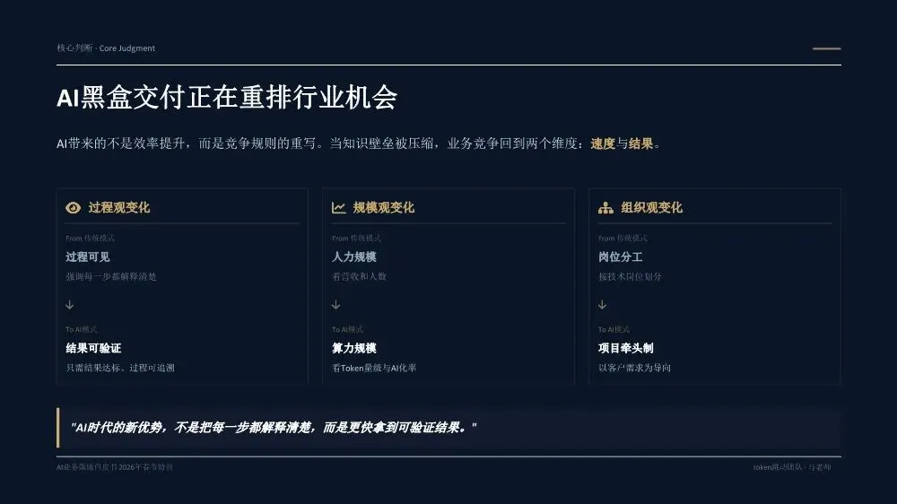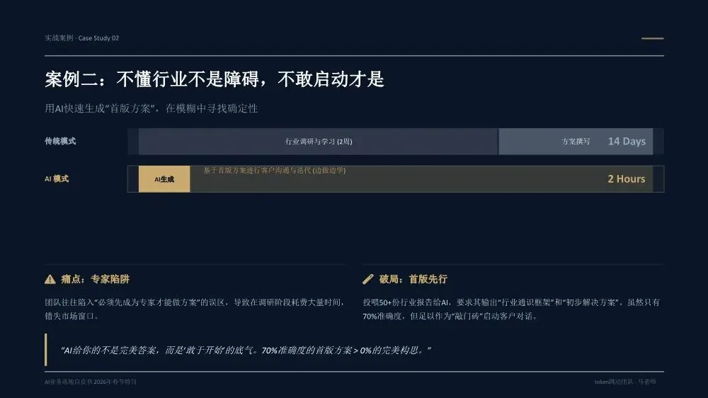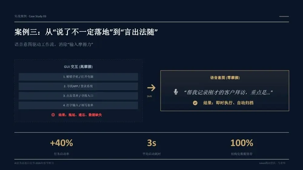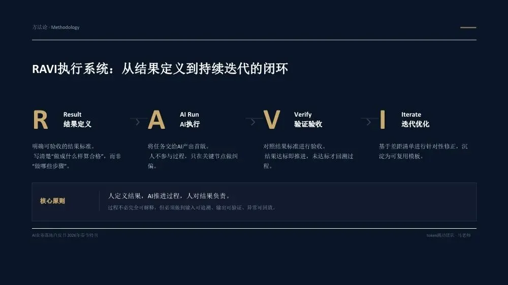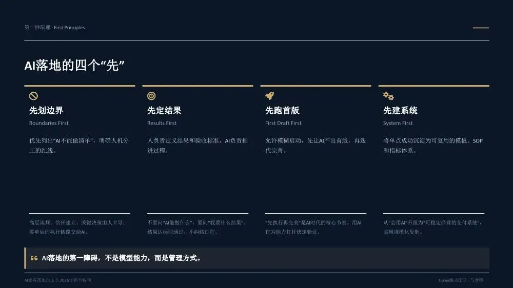 《AI业务落地白皮书(2026年春节特刊)》是一份由Token跳动团队基于20多个真实企业案例和超过300亿Token实践沉淀出的方法论指南,核心目标是帮助企业决策者实现从"会用AI"到"用AI赚钱"的跨越。核心洞察:为什么80%的企业AI项目停在试点阶段?白皮书开篇直指要害——当前企业AI落地面临三重结构性脱节:战略与执行脱节:管理层高谈AI战略,一线团队却仍在用旧流程和SOP执行任务。作者提出一个尖锐观点:"老板不下场,AI落地一定失真。" 这不是技术问题,而是权力重构问题。工具与业务脱节:团队购买大量AI工具,但没有嵌入核心业务链路(报价→销售→交付),工具沦为"玩具"而非生产力。关键诊断:"工具买了一堆,业务流程却没变。"投入与衡量脱节:企业喊"All in AI",但财务报表中没有算力/Token的独立科目,无法量化ROI。"没有独立账单,就无法衡量真实价值。"先划边界:优先列出"AI不能做清单",明确人机分工红线。高层谈判、信任建立、关键决策由人主导;签单后的执行链路交给AI。先定结果:人负责定义结果和验收标准,AI负责推进过程。不要问"AI能做什么",要问"我要什么结果"。结果达标即通过,不纠结过程。先跑首版:允许模糊启动,先让AI产出首版再迭代。"先执行再完美"是AI时代的核心节奏。70%准确度的首版方案,远胜于0%的完美构思。先建系统:将单点成功沉淀为可复用的模板、SOP和指标体系,从"会用AI"升级为"可稳定经营的交付系统"。- Result(结果定义):明确可验收的结果标准,写清楚"做成什么样算合格",而非"做哪些步骤"- AI Run(AI执行):将任务交给AI产出首版,人不参与过程,只在关键节点纠偏- Verify(验证验收):对照结果标准验收,达标即推进,未达标才回溯过程- Iterate(迭代优化):基于差距清单针对性修正,沉淀为可复用模板核心原则:人定义结果,AI推进过程,人对结果负责。过程不必完全可解释,但必须做到输入可追溯、输出可验证、异常可回放。创始人直接使用AI Agent进行业务推演,跳过中间汇报层,发现大量中间流程纯属"为了流程而流程"。成果:决策速度提升10倍,流程节点缩减40%。传统模式需要2周行业调研+方案撰写,AI模式下只需2小时:投喂50+份行业报告给AI生成"行业通识框架"和初步解决方案,作为"敲门砖"启动客户对话,边做边学。语音意图驱动工作流,消除"输入摩擦力"。相比GUI交互(解锁-找APP-点击-打字),语音实现3秒平均启动耗时,任务启动率提升40%,100%结构化数据留存。传统报价流程(需求沟通→方案撰写→内部审批→客户反馈→修订报价)需要5天,AI赋能流程(语音输入需求→AI生成报价单→会议结束即发送)只需5分钟。"当竞争对手还在回公司写PPT时,我们的报价单已在客户邮箱里。"从"人机对话"转向"结果托管":人类只下达目标(如"调研5家竞品并生成对比报告"),Agent自主拆解任务、调用工具、自我修正,直接交付PDF报告或预约成功的会议。核心价值不是"辅助"而是"替代",节省的不仅是时间,更是"心力"。建立Token经营账单,将AI从"IT成本中心"转为"业务投资中心"。例如:销售部方案生成ROI 1:20,每单成本0.8元;客服部自动应答效率提升40%,每次成本0.05元,替代2人力;研发部代码辅助提速30%,每人每月成本150元。- 项目牵头人:对最终业务结果负全责,定义目标与验收标准,协调资源与解决卡点- 数字员工(AI Agent):承担80%执行工作,7×24小时即时响应,零情绪、零遗忘、零偏差- 领域专家/教练:为AI提供专业知识养料,审核AI产出质量,处理AI无法解决的Corner Case三条硬规则:一人负责到底,拒绝"接力棒"式交接;凡是AI能做的,禁止人工介入;专家服务于项目,而非部门。北极星指标(最终业务价值):人均毛利增长、单位交付成本、业务净利润率质量指标(交付标准):AI产出可用率、客户满意度(NPS)、返工率过程指标(执行效率):任务平均耗时、AI工具渗透率、流程节点数经营指标(成本控制):Token/单产出、算力成本占比、工具订阅ROI核心原则:如果AI带来的效率提升(过程指标)不能转化为利润增长(北极星指标),这种"提效"就是伪命题。- 交付结果(权重40%):不再关注"你做了多久",只关注"你交付了什么"- 响应速度(权重20%):AI赋予"即时响应"能力,速度本身就是核心竞争力- 资产复用(权重20%):核心增量指标,员工需将经验沉淀为Prompt或Agent供他人复用- 经营意识(权重20%):考核AI资源利用效率,鼓励用最小Token成本产出最大价值关键洞察:在AI时代,"苦劳"不再是功劳。如果不沉淀资产,每一次工作都是在浪费经验。第1-30天(Ignition):寻找高频痛点,跑通第一个最小闭环。盘点业务全流程,锁定"高频、重复、有痛点"的单一任务,编写优化Prompt,产出可用Demo,记录Token消耗与产出质量,计算初步ROI。交付物:一个被验证可行的AI应用场景+清晰的ROI测算模型。第31-60天:把单点成功扩展为多流程可复制。提取3-5个高频业务场景编写标准Prompt,搭建统一的Prompt库和知识库,选拔内部"AI种子选手"进行传帮带式培训。交付物:3-5个成熟AI业务流+企业级Prompt资产库。第61-90天:将AI纳入正式经营系统。经营并表(Token计入部门COGS,设立AI专项预算),组织固化(设立AI运营官/提示词工程师,建立内部培训与认证体系),系统升级(建立反馈-清洗-微调数据闭环,部署企业级合规网关)。- 数据绝不出境:核心业务数据必须私有化部署或脱敏处理- 决策绝不脱离人:AI仅作为辅助建议者,关键业务决策必须由人最终确认四类核心治理机制:输入围栏(P