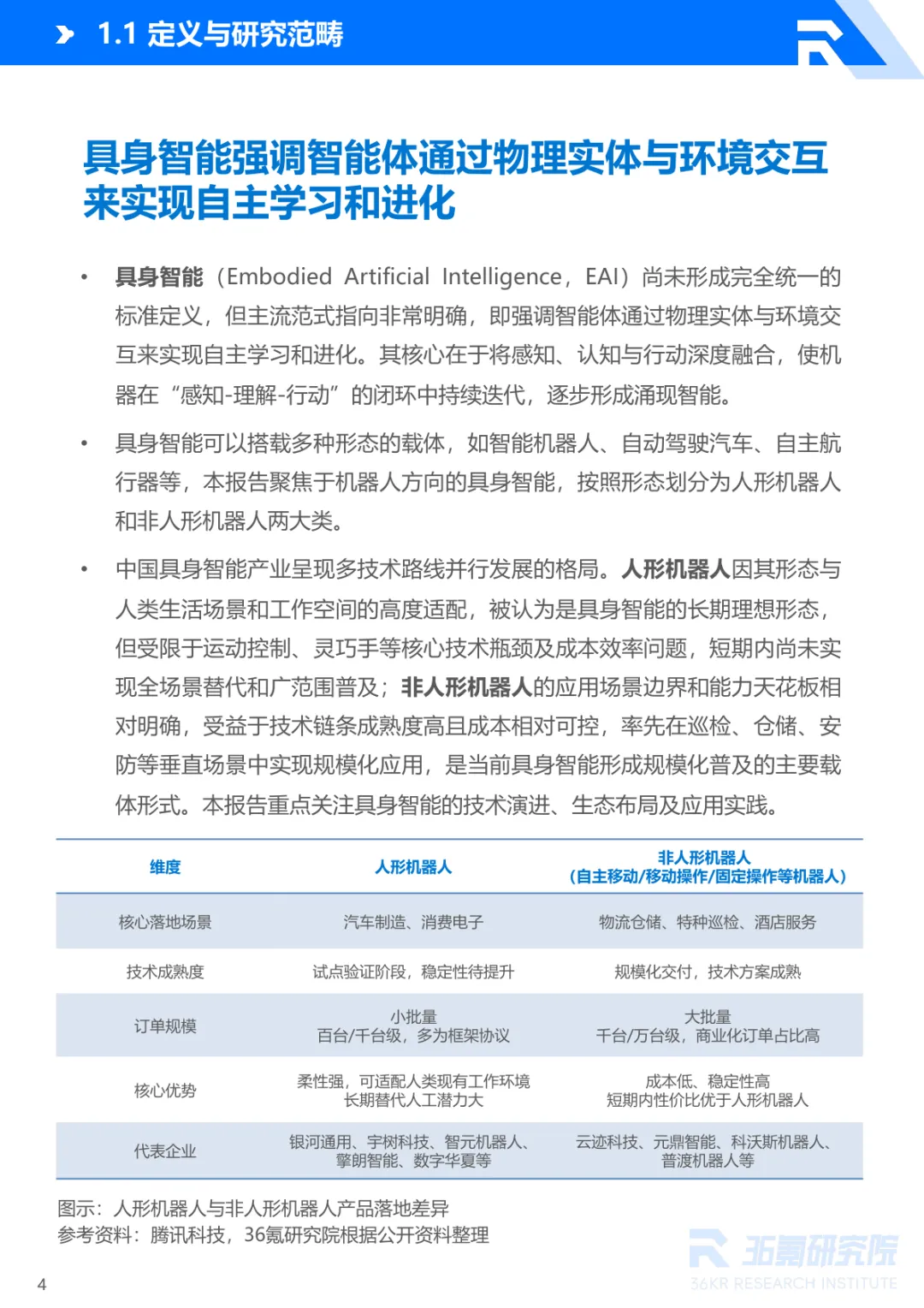 2026具身智能产业发展研究报告:软硬件迭代加速,人形机器人开启规模突破!《2026年具身智能产业发展研究报告》由36氪研究院发布,系统梳理中国具身智能产业现状、生态格局、典型案例与未来趋势,聚焦人形机器人规模化量产与多场景落地,揭示政策、技术、需求、资本四大驱动力下的产业变革,为行业发展提供权威参考。