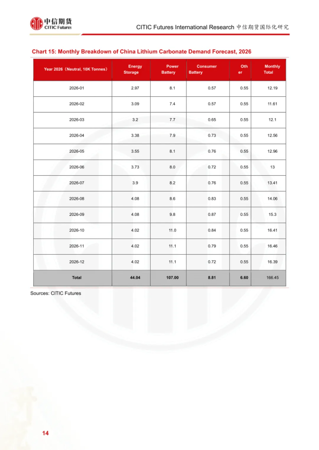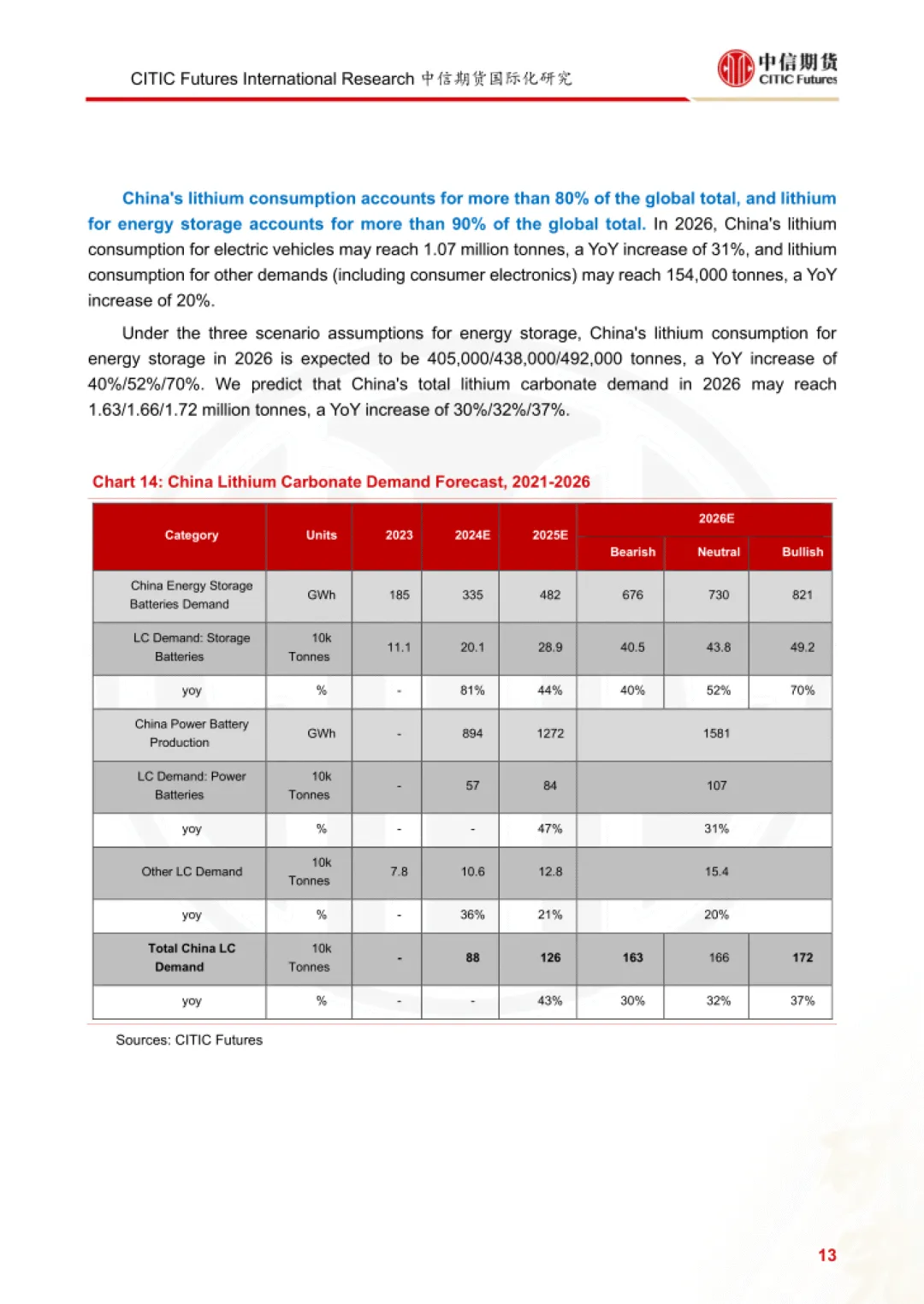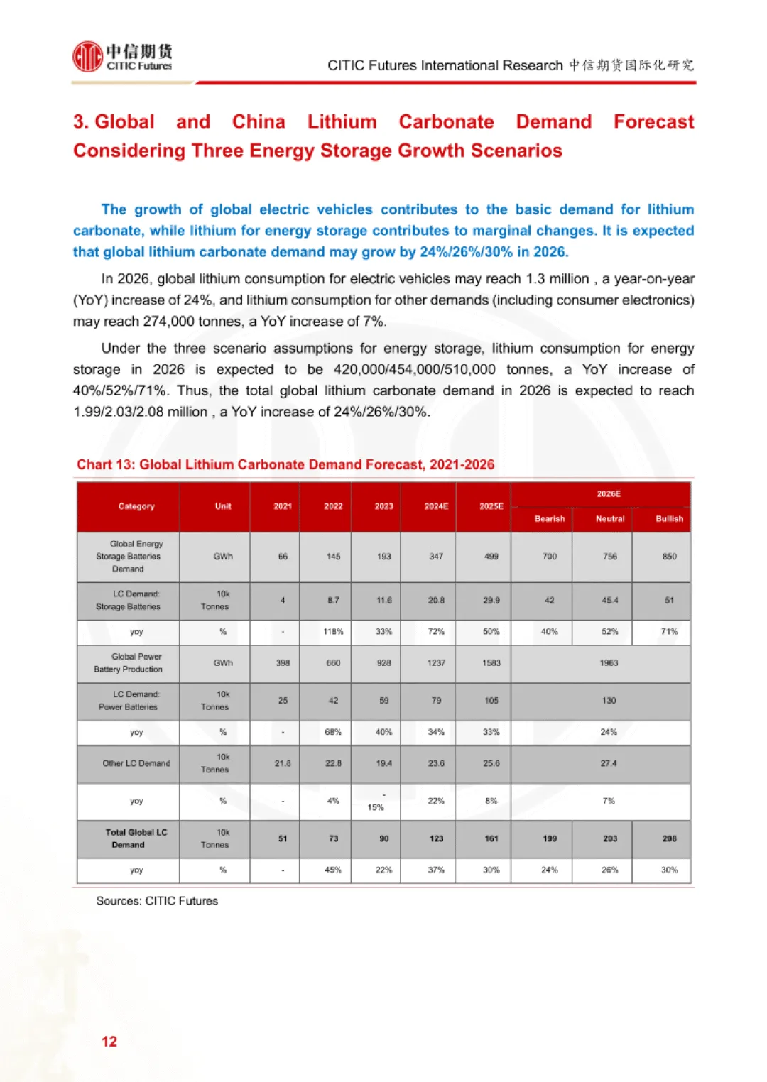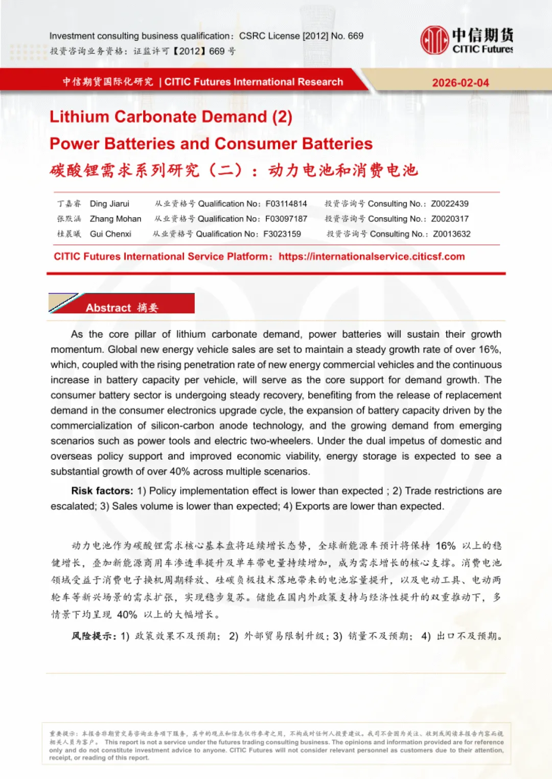 报告为中信期货 2026 年 2 月发布的碳酸锂需求研究报告,聚焦动力电池、消费电池两大核心领域,结合储能三种增长情景,测算 2026 年全球及中国碳酸锂需求规模与增速,并指出行业核心驱动因素与潜在风险。