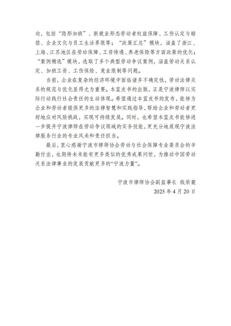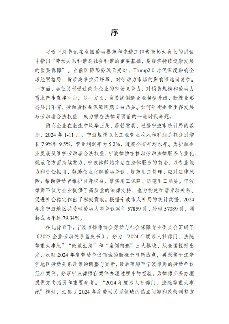 《2025企业劳动关系蓝皮书》由宁波市律师协会劳动与社会保障专业委员会汇编,聚焦2024年劳动关系领域的新动态、新政策与典型案例,为企业用工管理和劳动者权益维护提供了全面指引。