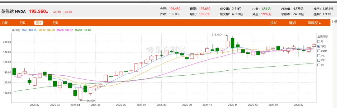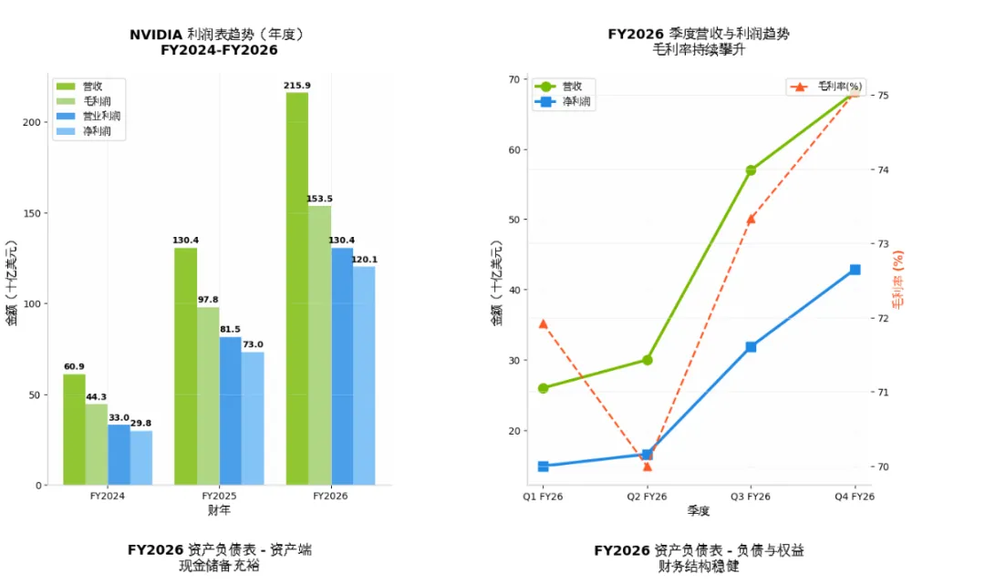 英伟达最新财报公布,从公布的情况来看,还是超预期的。从2025年2月开始,英伟达的股价基本上一直处于稳步抬升的状态,虽然中间偶尔略有波动,但其股价和基本面,整体还是处于强劲的状态。英伟达的财务报告,可谓是全球资本市场最为关注的财务了。市场高度关注的业绩指引方面,英伟达预计第一财季营收764.4亿美元到795.6亿美元,高于市场预估的727.8亿美元。市场整体也给予了较高的估值:2025年全年营收达到681亿美元,同比增长73%;净利润430亿美元,同比增长94%。公司全年营收2159.4亿美元(约合14834.0亿元),同比增长65%;净利润则达到1200.8亿美元(约合8248.9亿元),同比增长65%。以日计算,英伟达平均每天赚22亿元。真是牛的!注:数据中心业务占比已超过90%,是绝对的营收支柱。