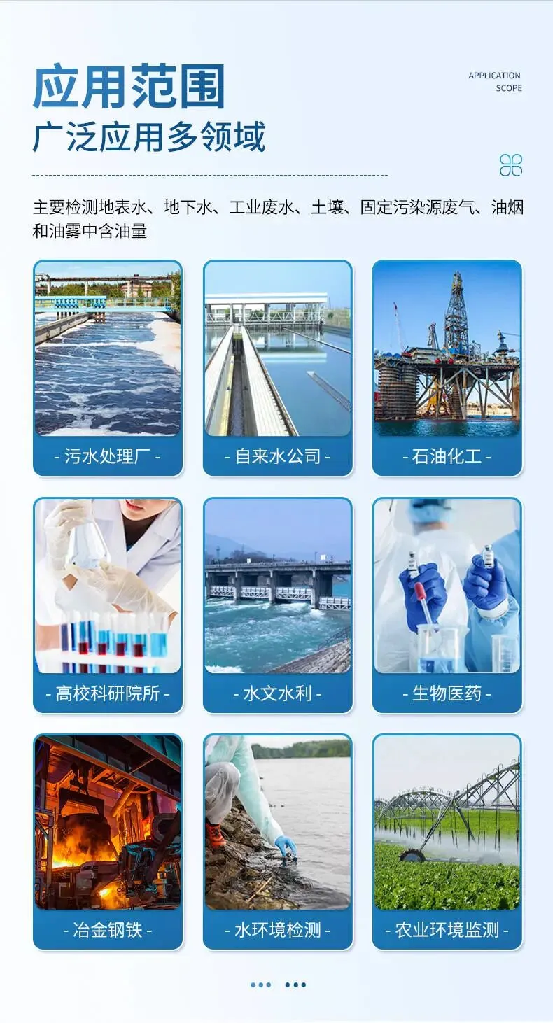- 环境监测系统:地表水、地下水、工业废水、土壤中油类污染物的检测。
