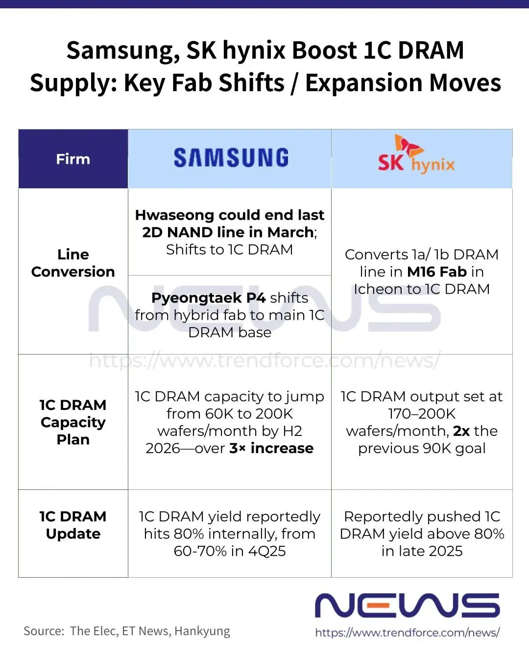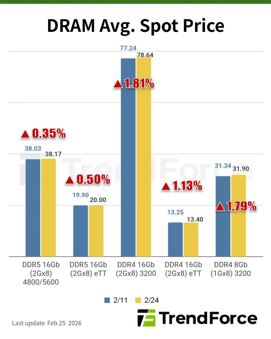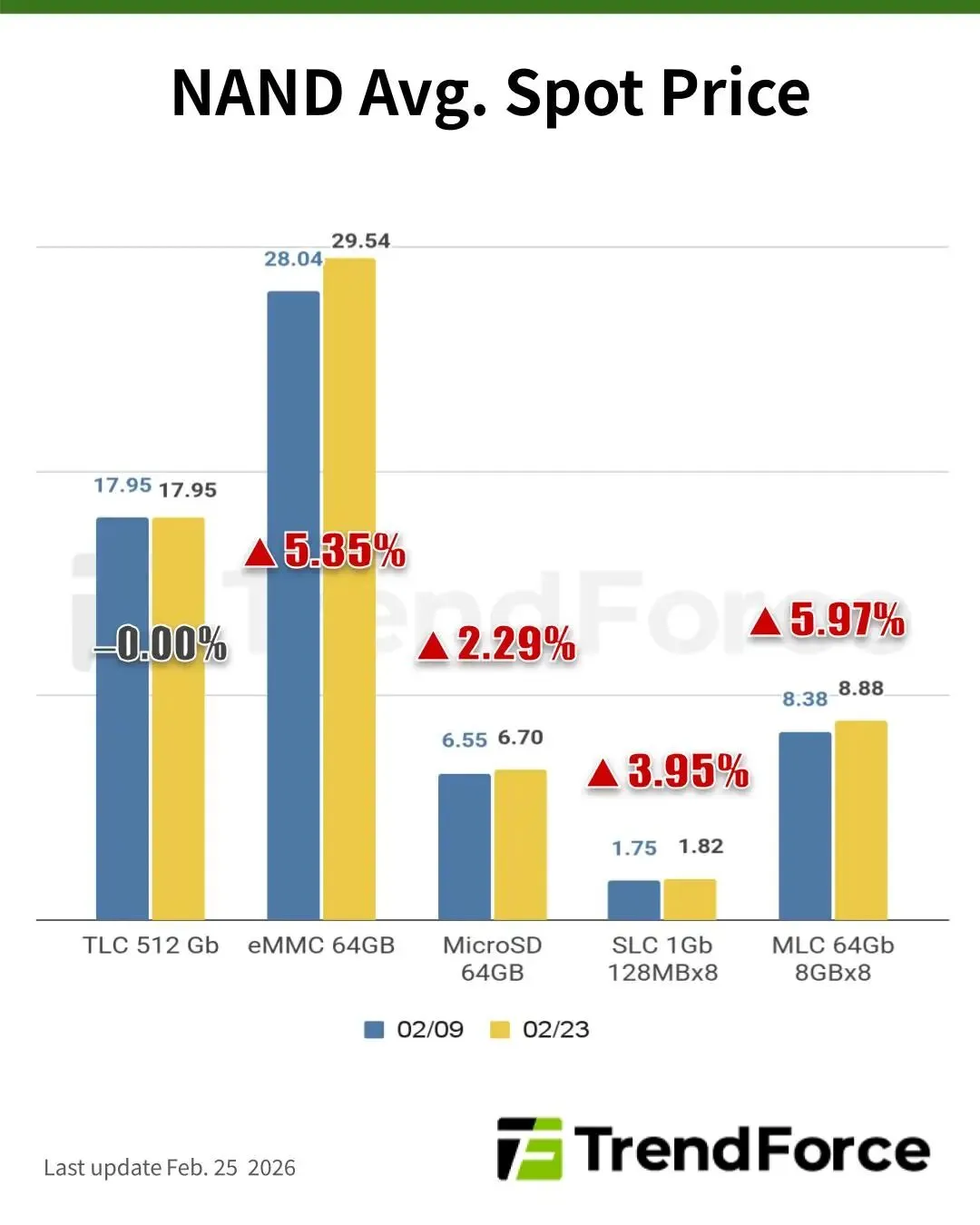 • 价格“超通胀”:本周 TrendForce 修正数据,2026 Q1 常规 DRAM 合约价涨幅上调至 90%-95%,NAND Flash 涨幅上调至 55%-60%。