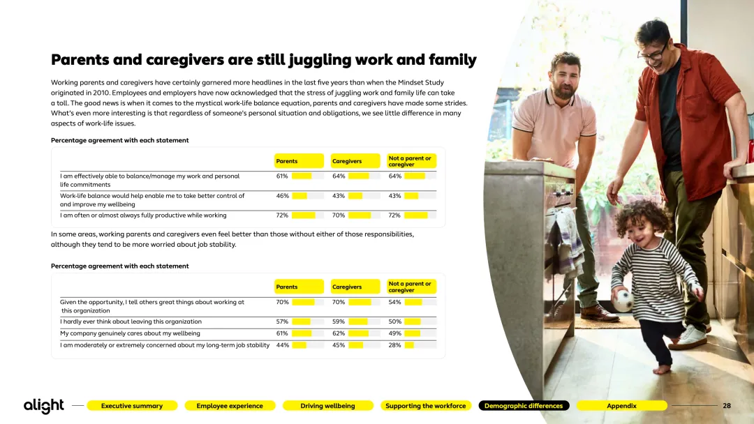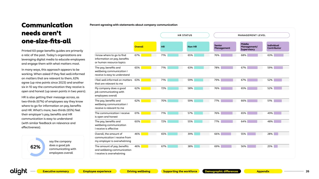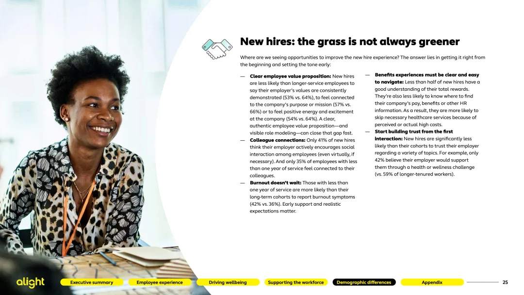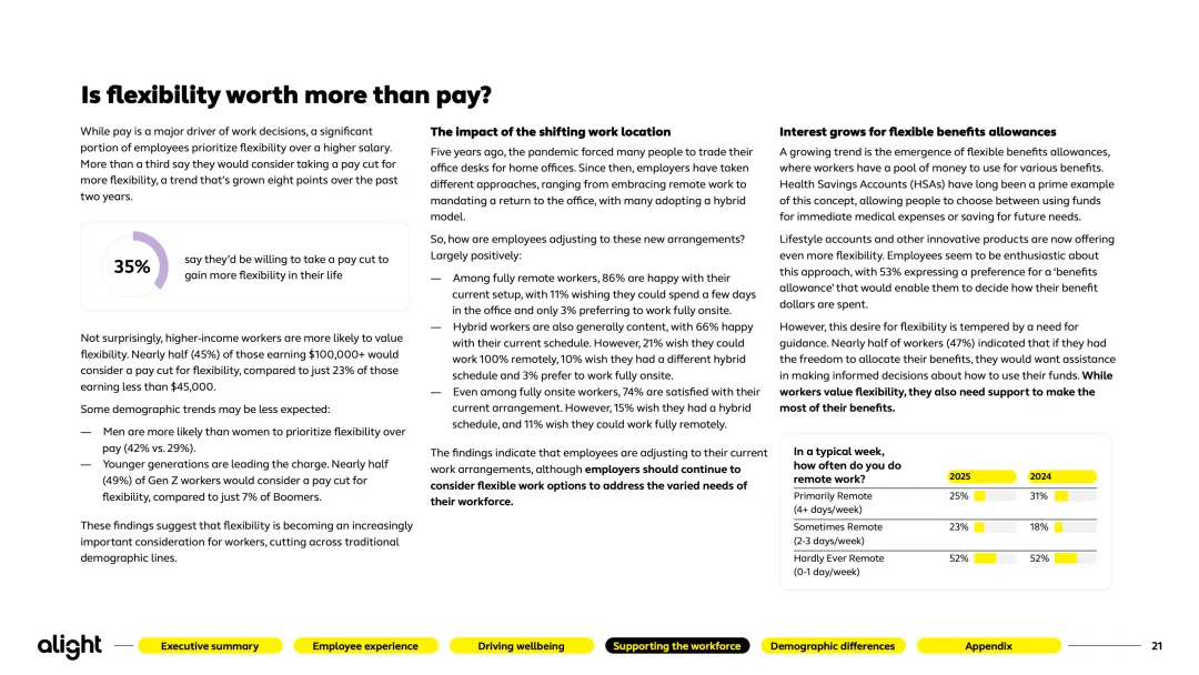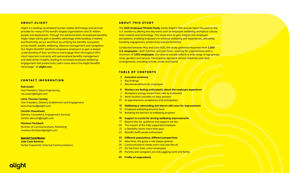 本报告基于Alight对2500名美国员工的系统性调研,覆盖不同年龄、行业与用工形态,刻画出2025年美国劳动力在体验、福祉与技术冲击下的真实心态轮廓。研究显示,员工整体情绪正在修复,但结构性矛盾依然突出。