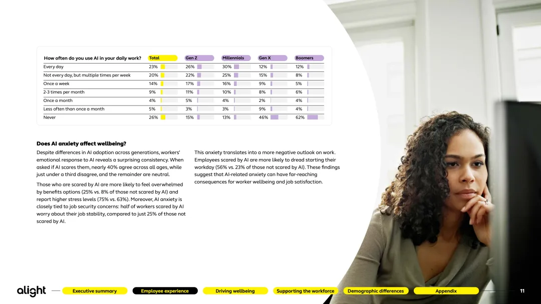 AI正在成为新的分化变量。近四分之一员工每日使用AI,43%认为其提升效率,但三分之一担忧被取代。AI焦虑者在压力感、工作倦怠和职业不安全感上显著更高,显示技术红利若缺乏制度性托底,可能反噬员工福祉。