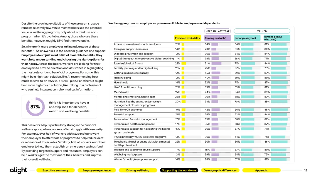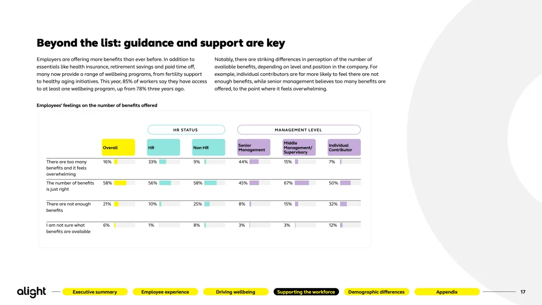 福利供给与使用之间的落差持续存在。85%的员工可获得至少一种福祉项目,但单项使用率仅约30%。60%自认“懂福利”的员工,忠诚度高出25%,更可能将福利视为长期投资,说明问题不在供给,而在理解、指引与决策支持不足。