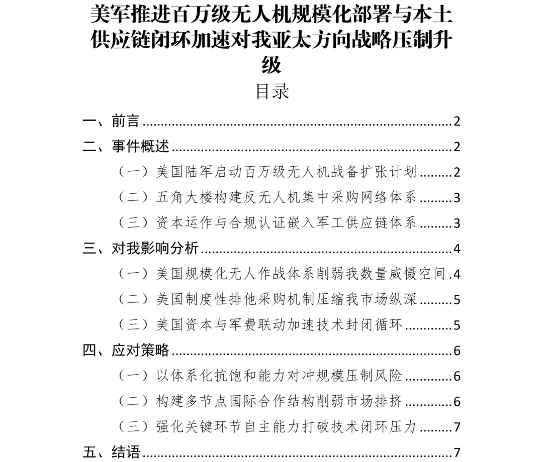 同一时间段内,五角大楼反无人机在线采购平台宣布达到初始作战能力,相关企业加速推进NDAA合规认证与本土产能扩张。上述动向显示,美方正以战场经验为牵引,在作战理念、采购制度与产业结构层面同步提速,试图在短周期内完成无人体系的规模化重构,相关政策信号密集释放,战略指向清晰。