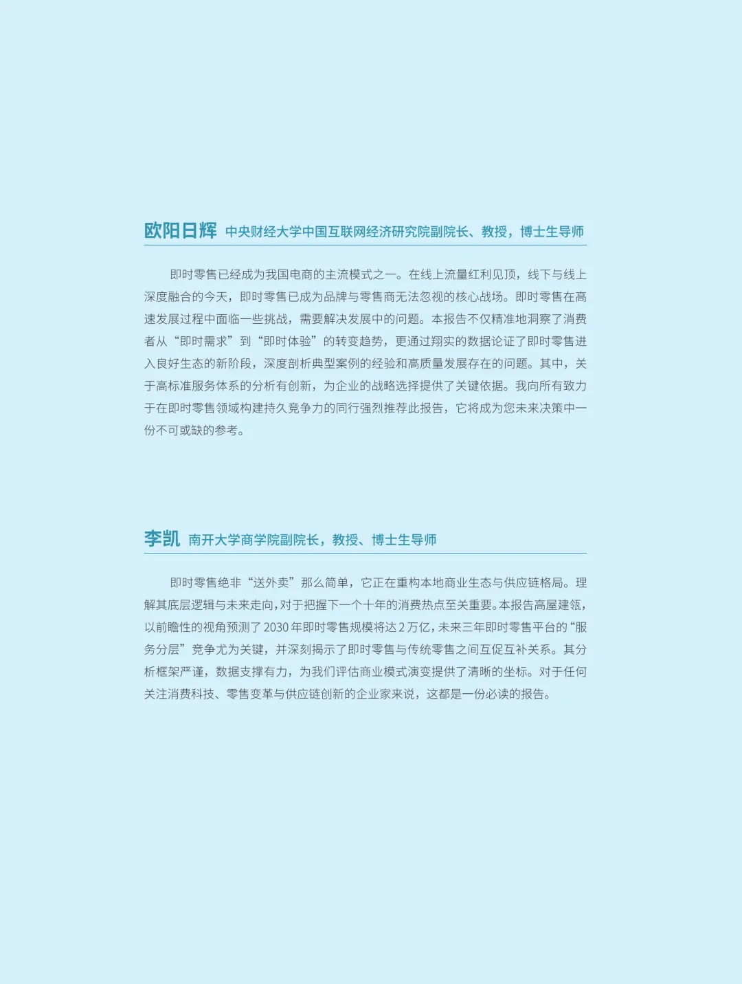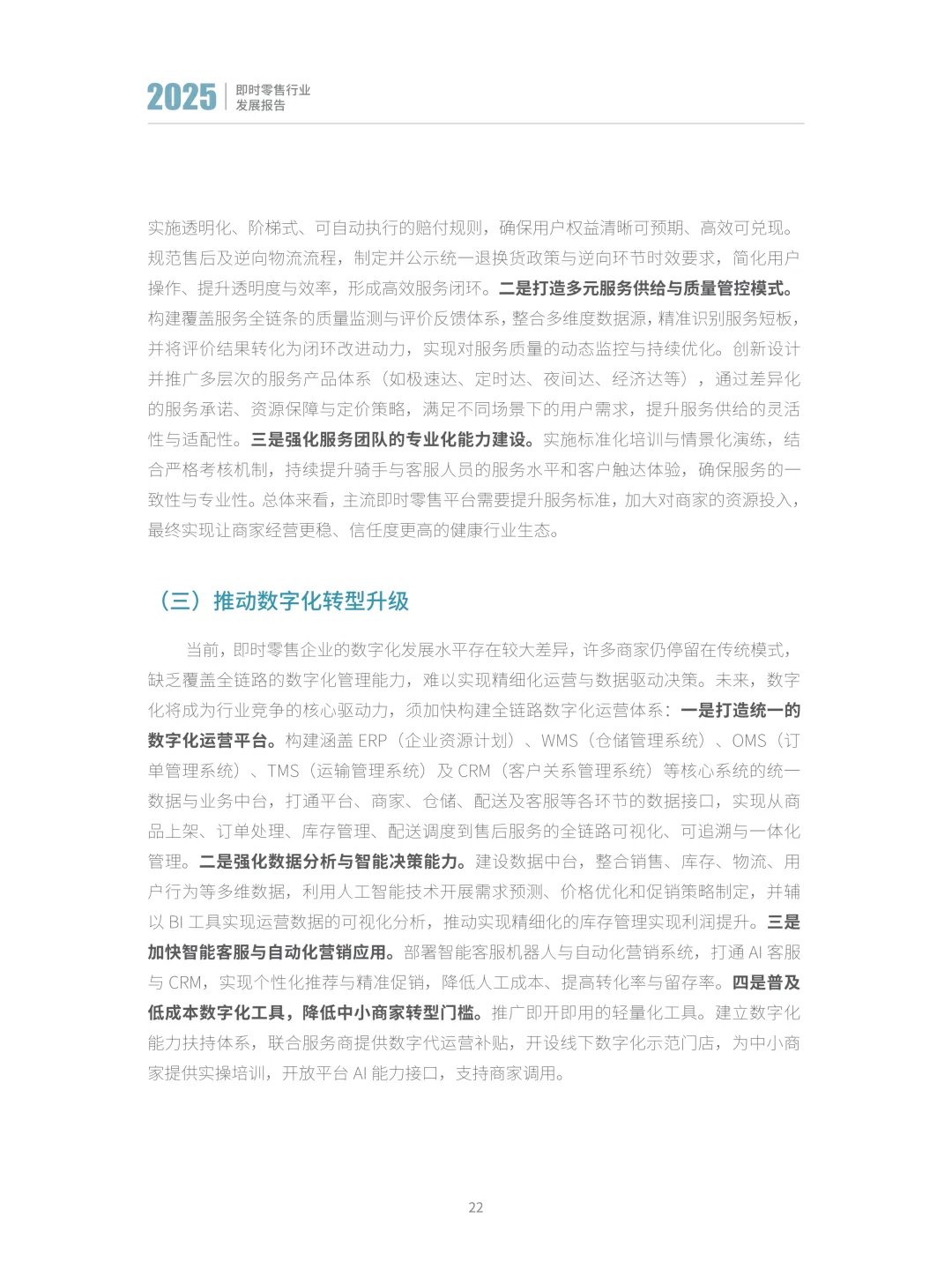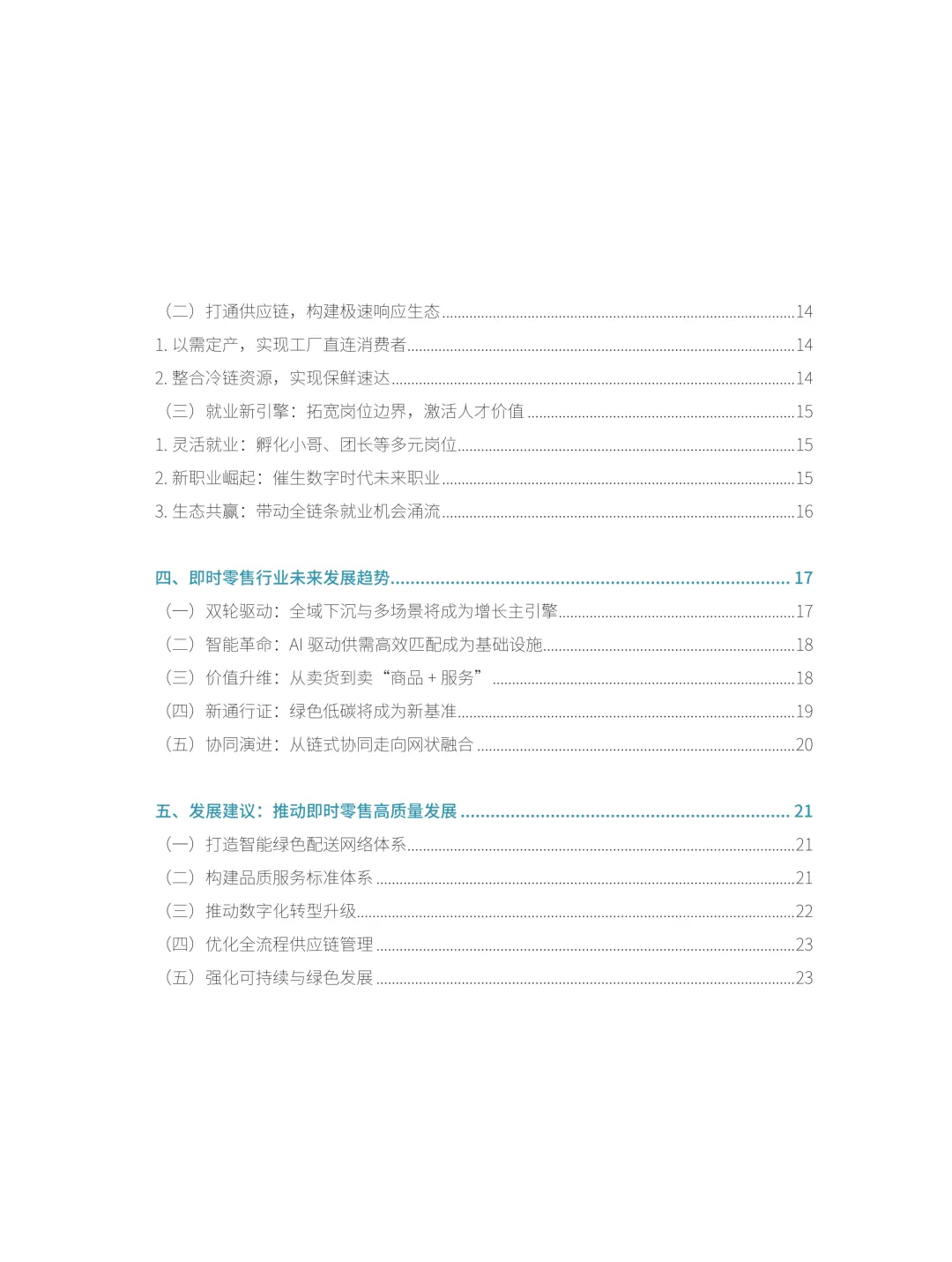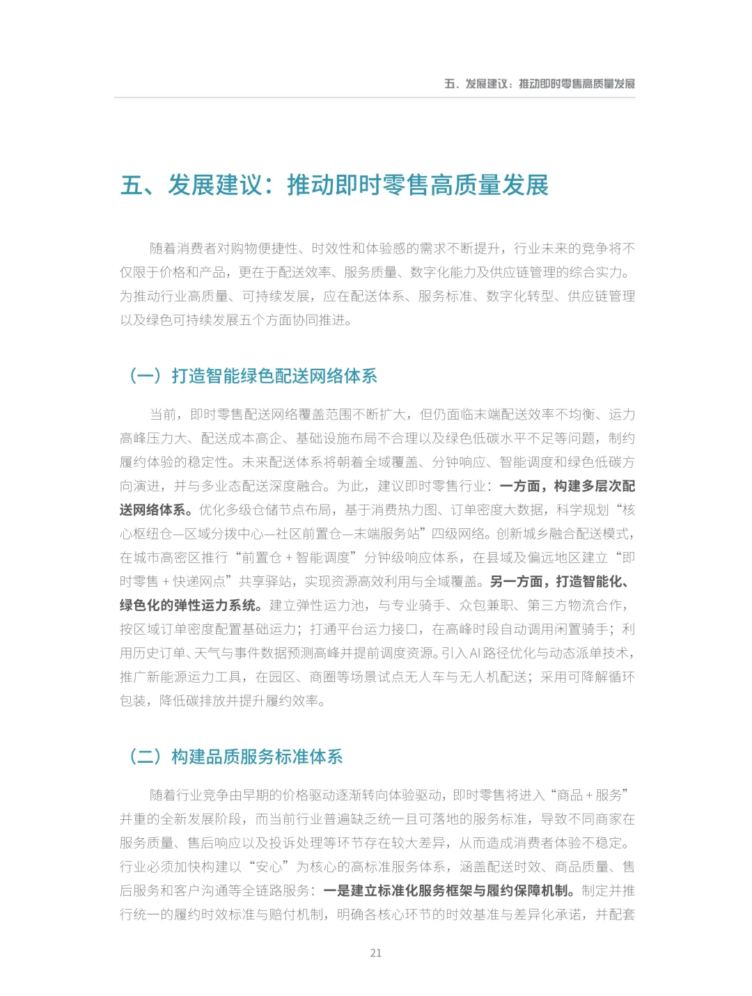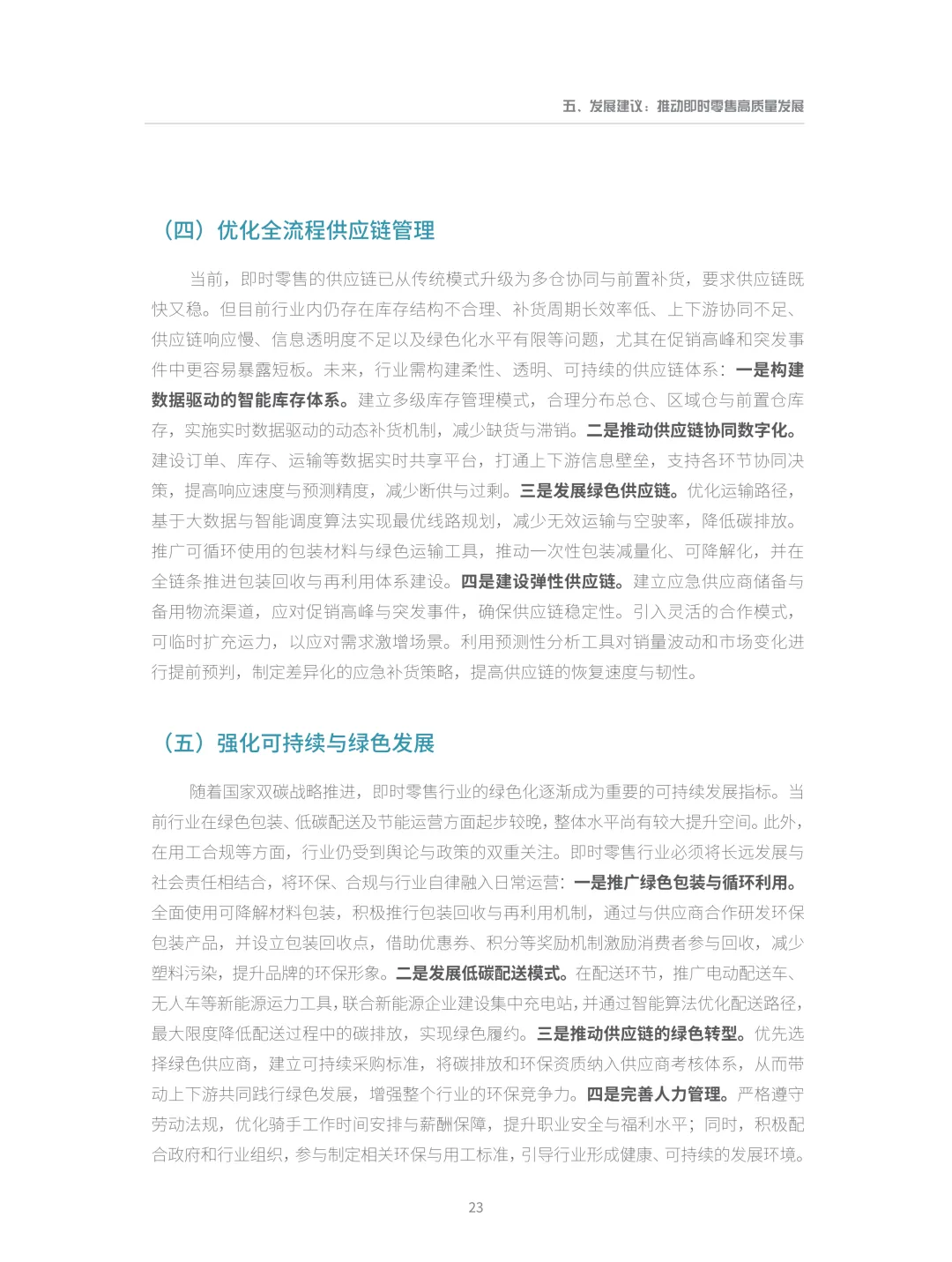 未来即时零售将呈现全域下沉与多场景覆盖(增长主引擎,从扩面到扩面 + 提密度)、AI 驱动履约(全链条智能化,成为行业基础设施)、“商品 + 服务” 价值升维(从送货到全流程体验交付)、绿色低碳成新基准(政策与行业发展双重要求)、从链式协同到网状融合(供应链社会化一盘货,平台 - 商家 - 品牌共建生态闭环)的发展格局,行业从单纯商品交易向全链路生活服务升级。 - 5.发展建议:五大维度发力,推动高质量发展